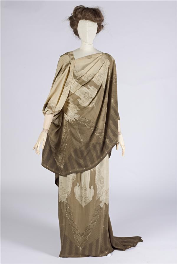 Jurk van gebatikte crêpe de chine zijde in beige- en...