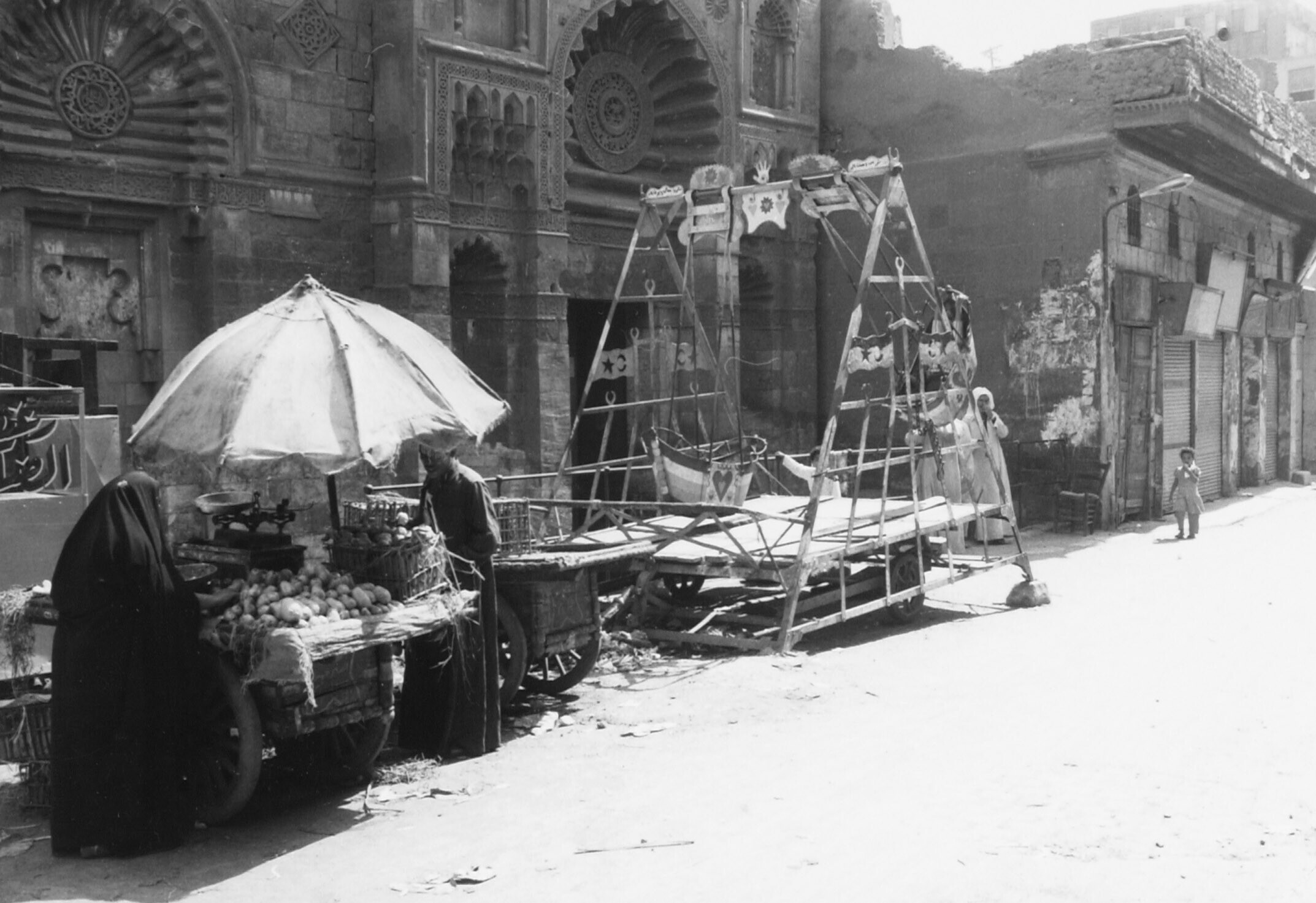 Stadsbeeld in oud Caïro; een fruitverkoper en schomm...