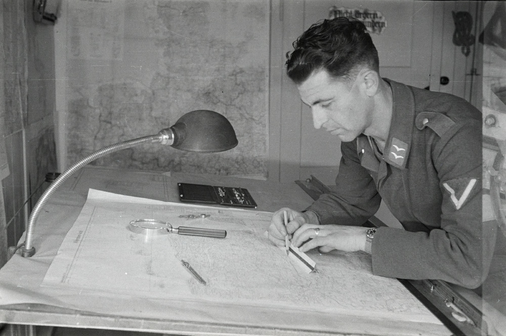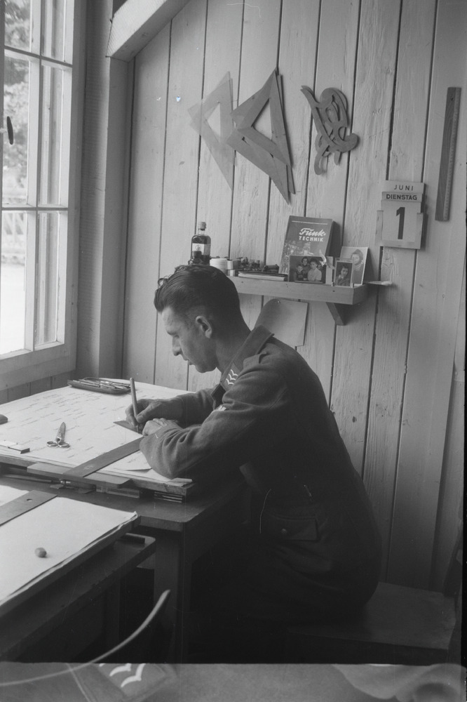 Een Luftwaffe Obergefreiter zit achter zijn tekentafel.