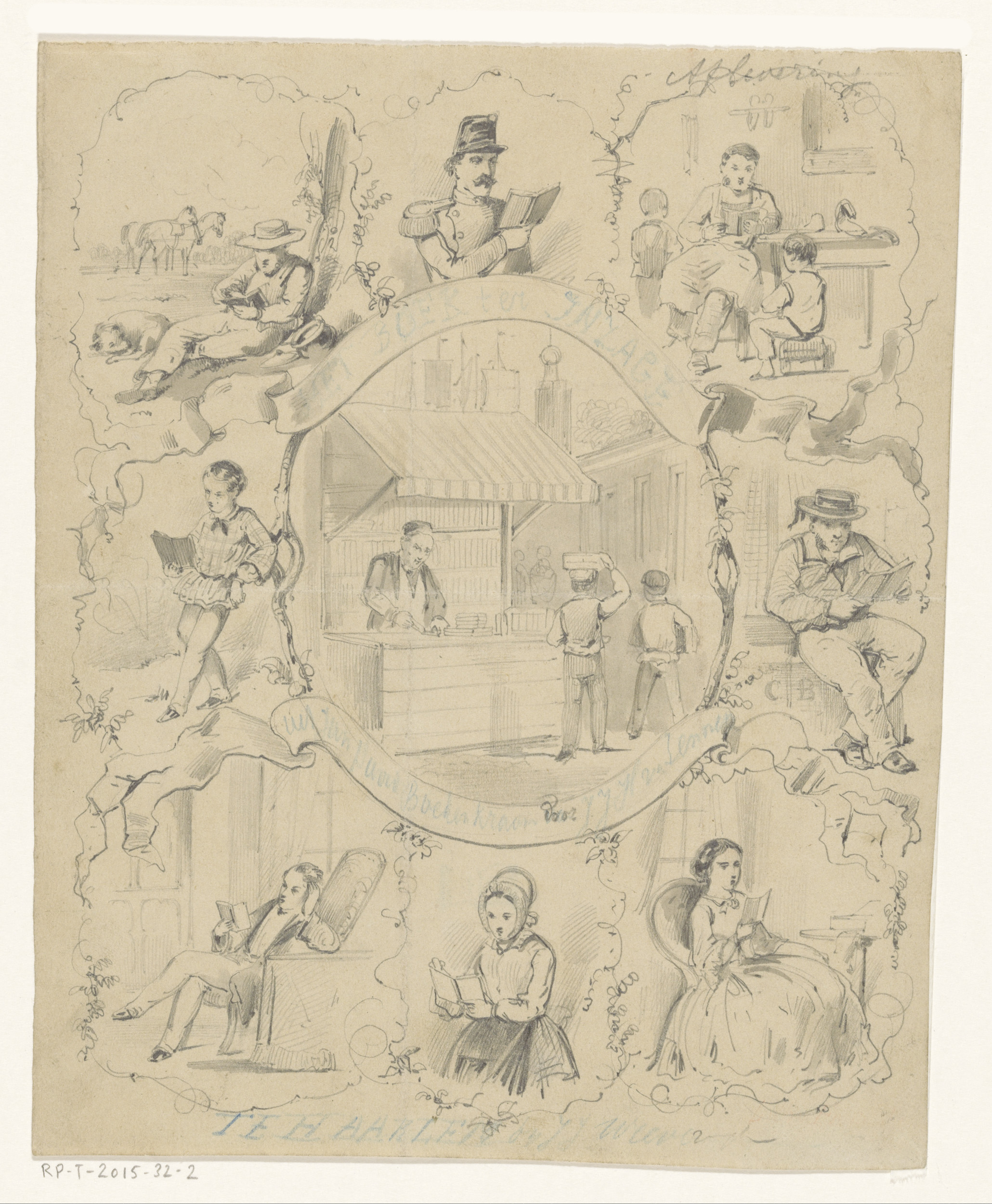 Boekenkraam op een markt omgeven door acht scènes me...