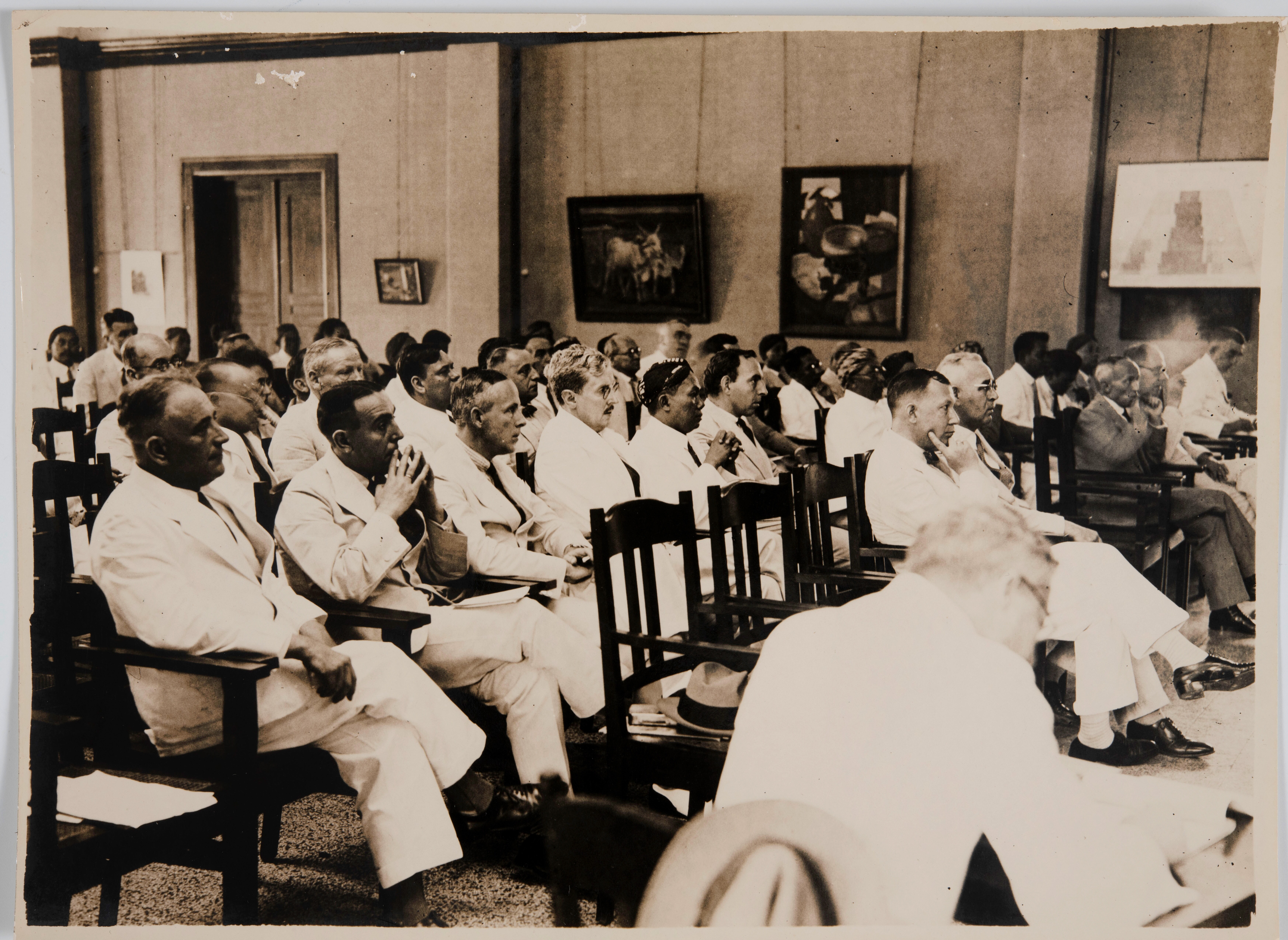 Groepsportret bij een feestelijke aangelegenheid op ...