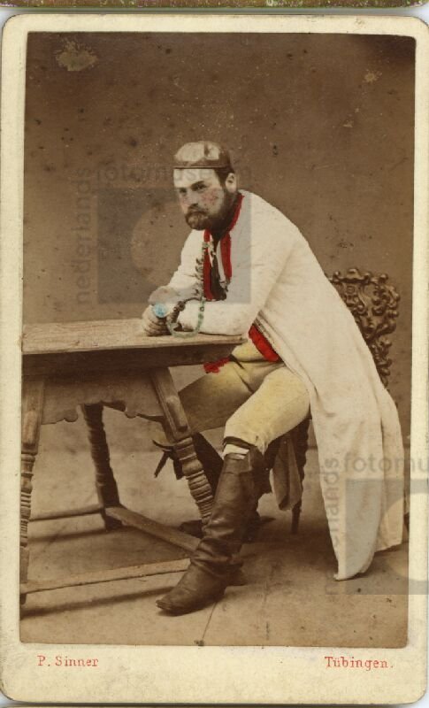 Studioportret van ten voeten uit, aan tafel zittende...