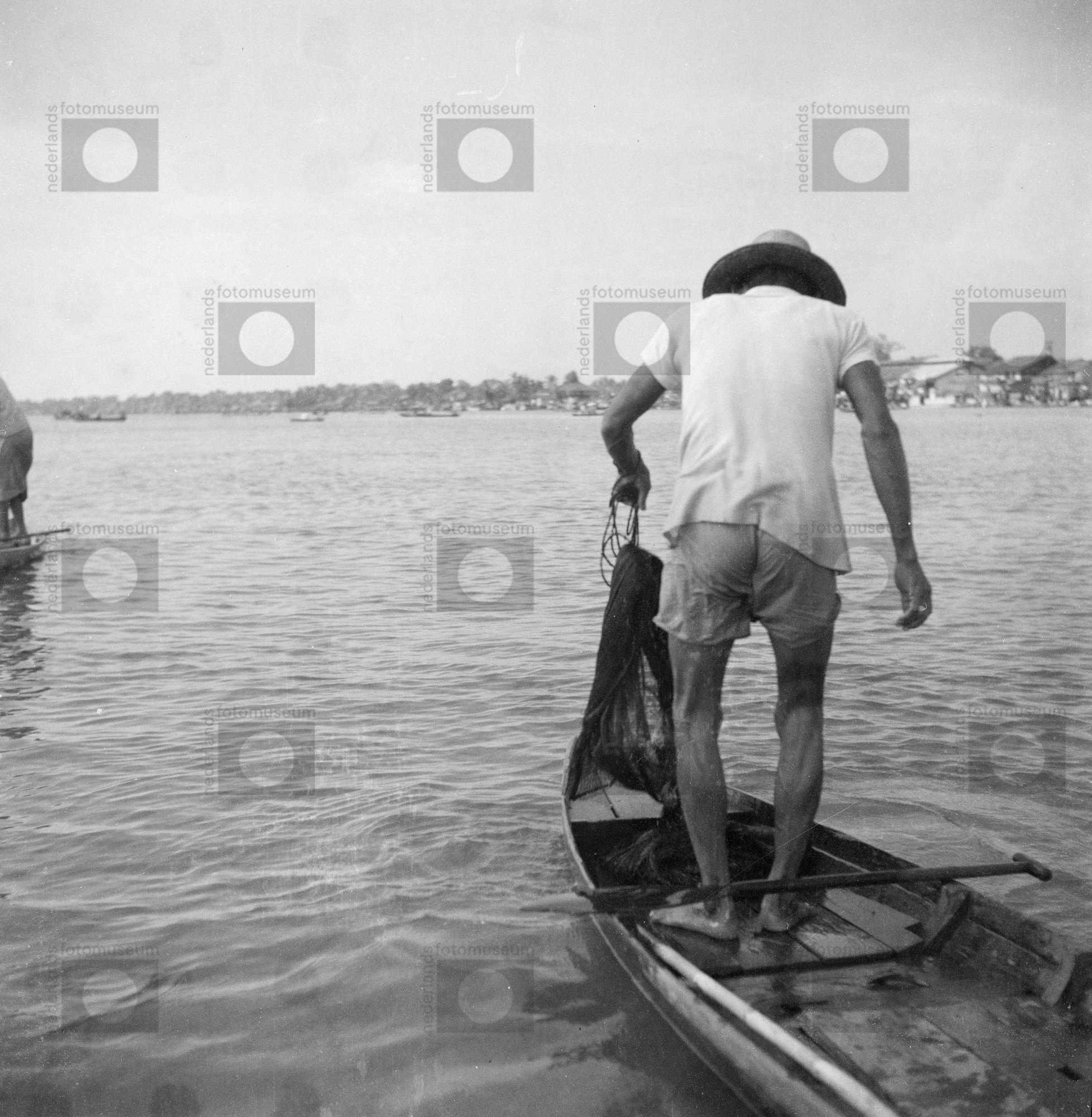 Een man houdt een visnet vast, terwijl hij in zijn b...