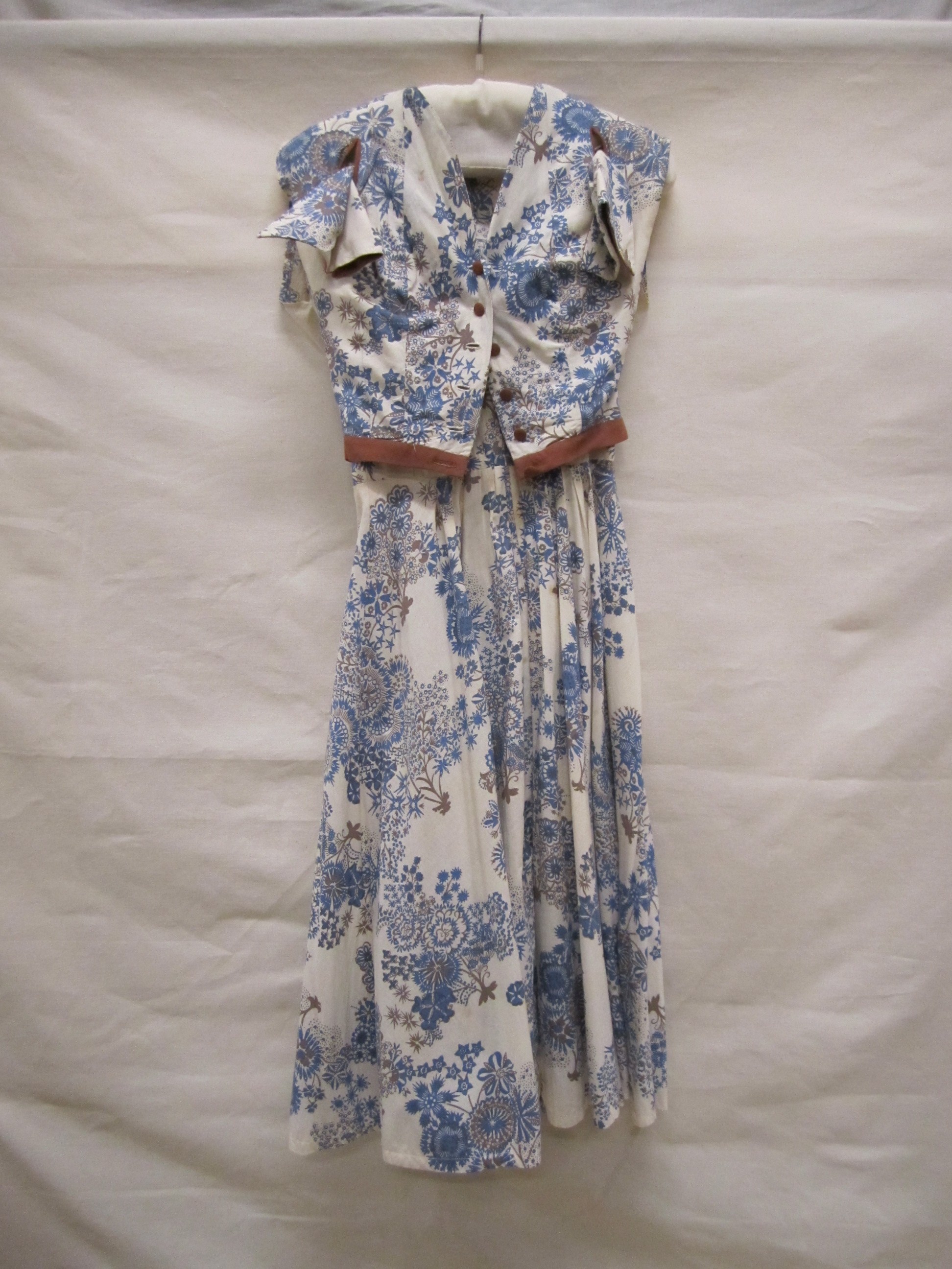 Zomerjurk van wit katoen bedrukt met blauwe en bruin...