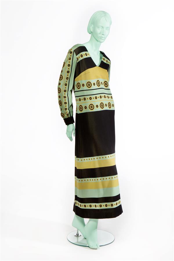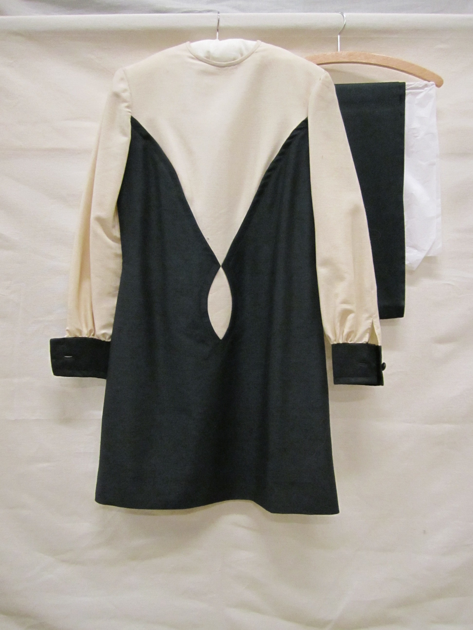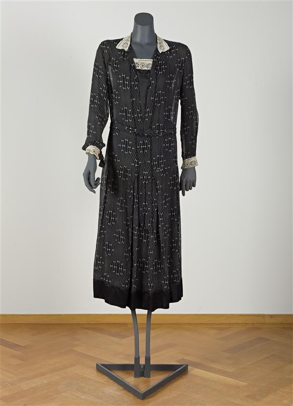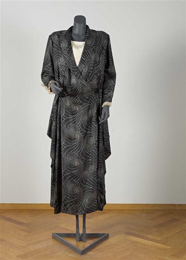 Jurk van zwarte zijde met witte, uitgespaarde spiraa...