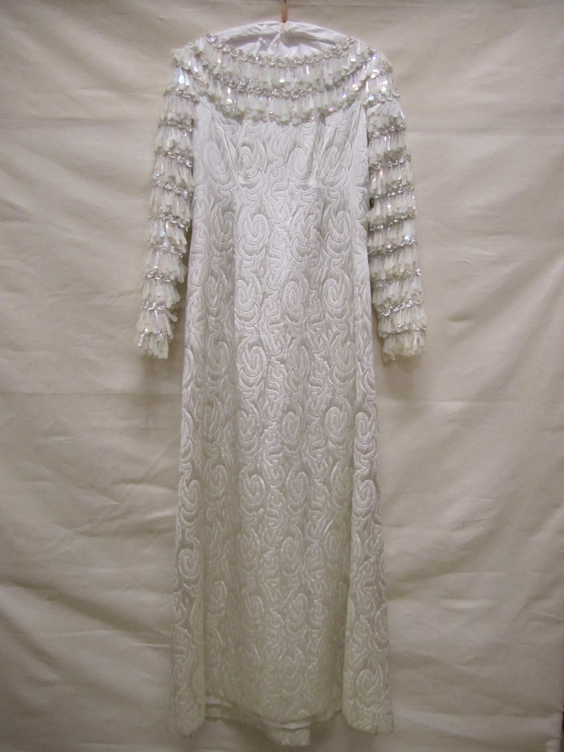 Avondjurk, van wit synthetisch weefsel met relief en...