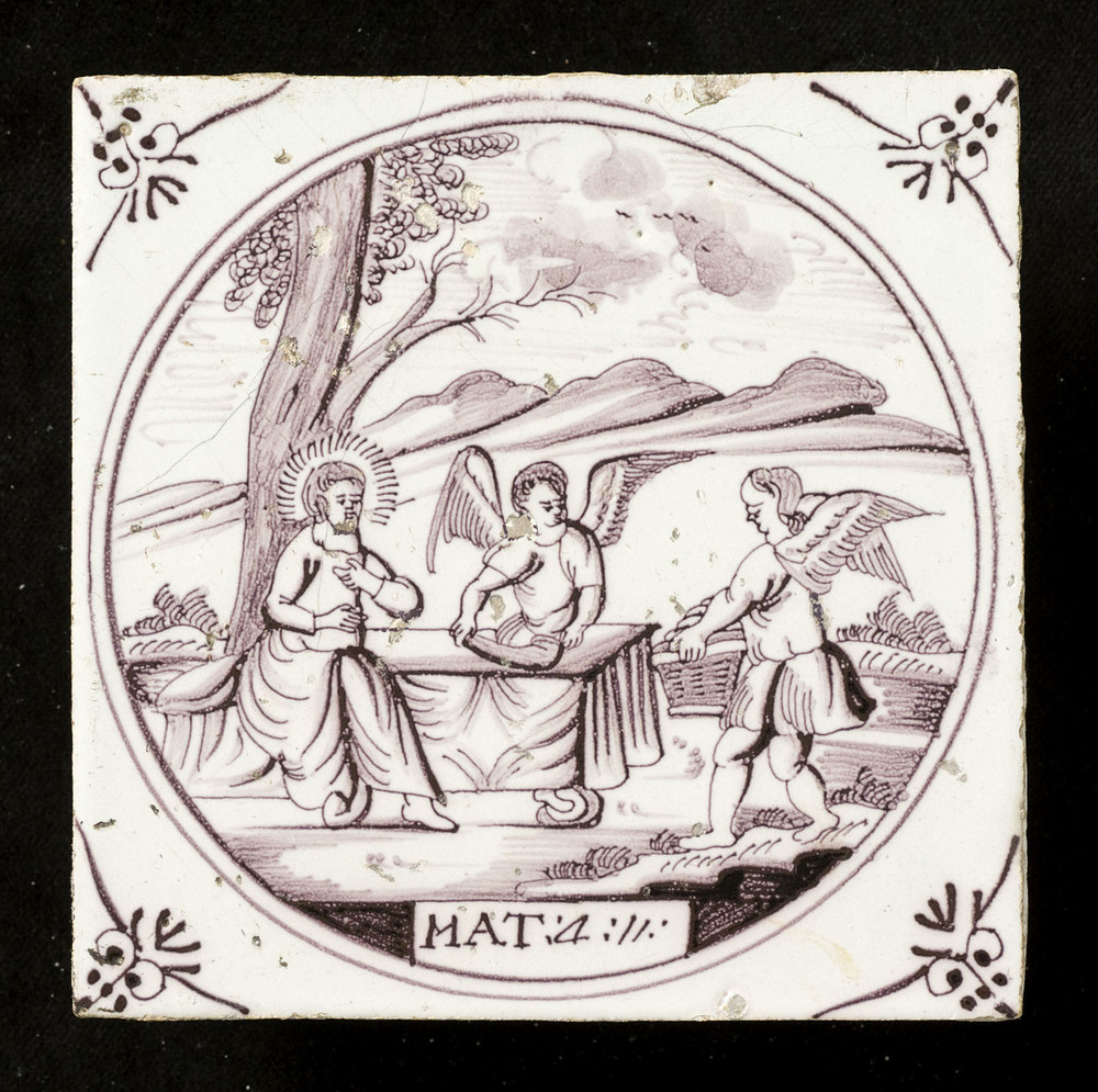 Tegel in tinglazuur, voorstellende mat. 4:11 Jezus d...