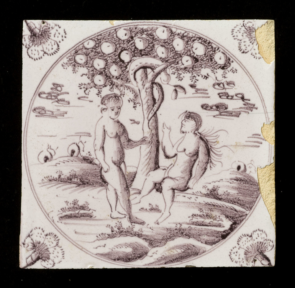 Tegel in tinglazuur, voorstellende gen,3:6, Adam en ...
