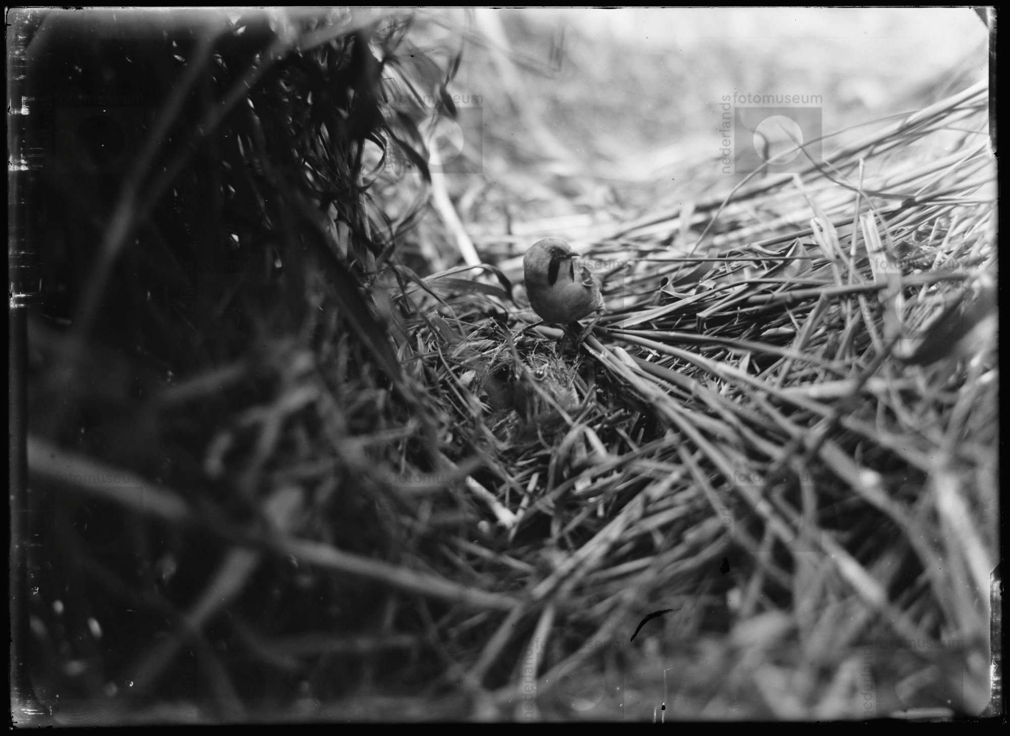 Mannetje Baardman bij nest met jongen, Ramspol (1925)
