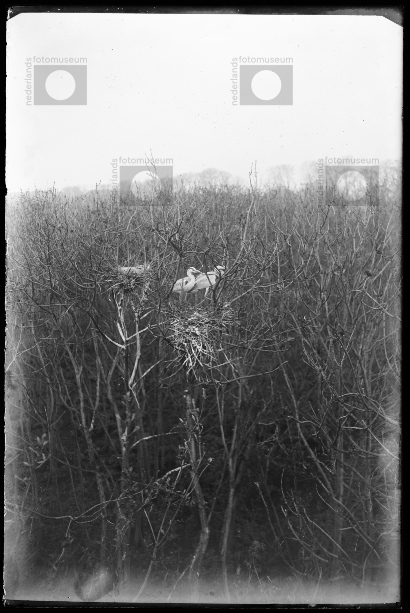 Blauwe reigers bij nest in broedkolonie, Sloten, (1931)