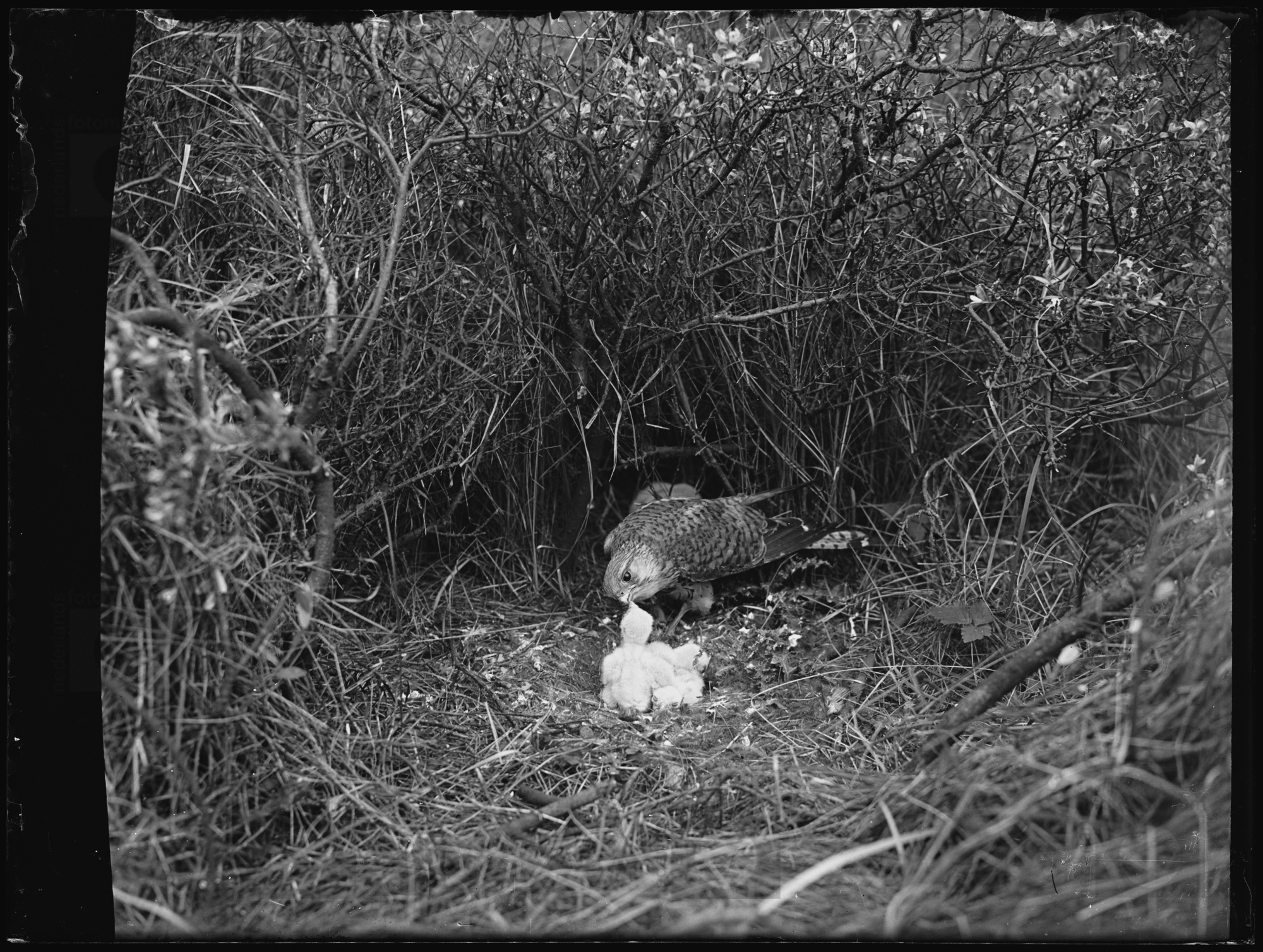 Geelgors bij nest met jongen, Ede (1916)