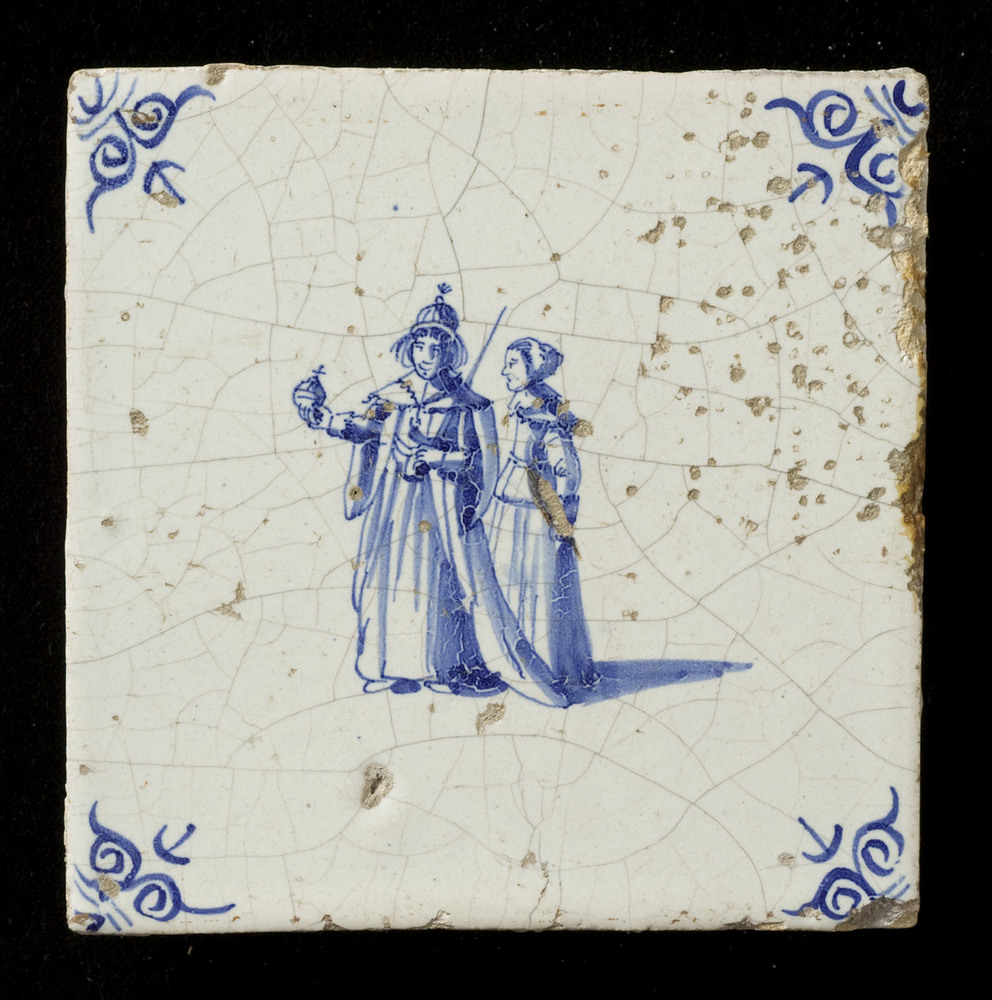 Tegel van keramiek met tinglazuur, voorstellende: De...