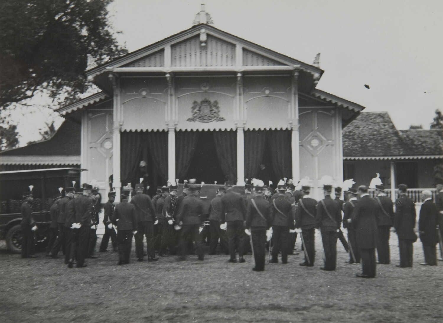 The coffin with the body of A.P. van Aken in front o...
