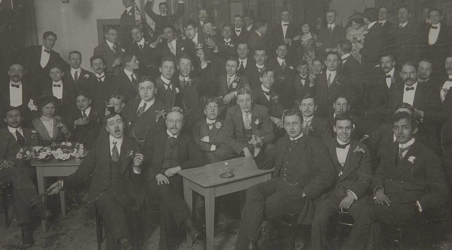 Groepsportret tijdens een feestmaaltijd