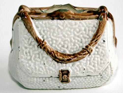 Keramiek witte spaarpot als handtas.