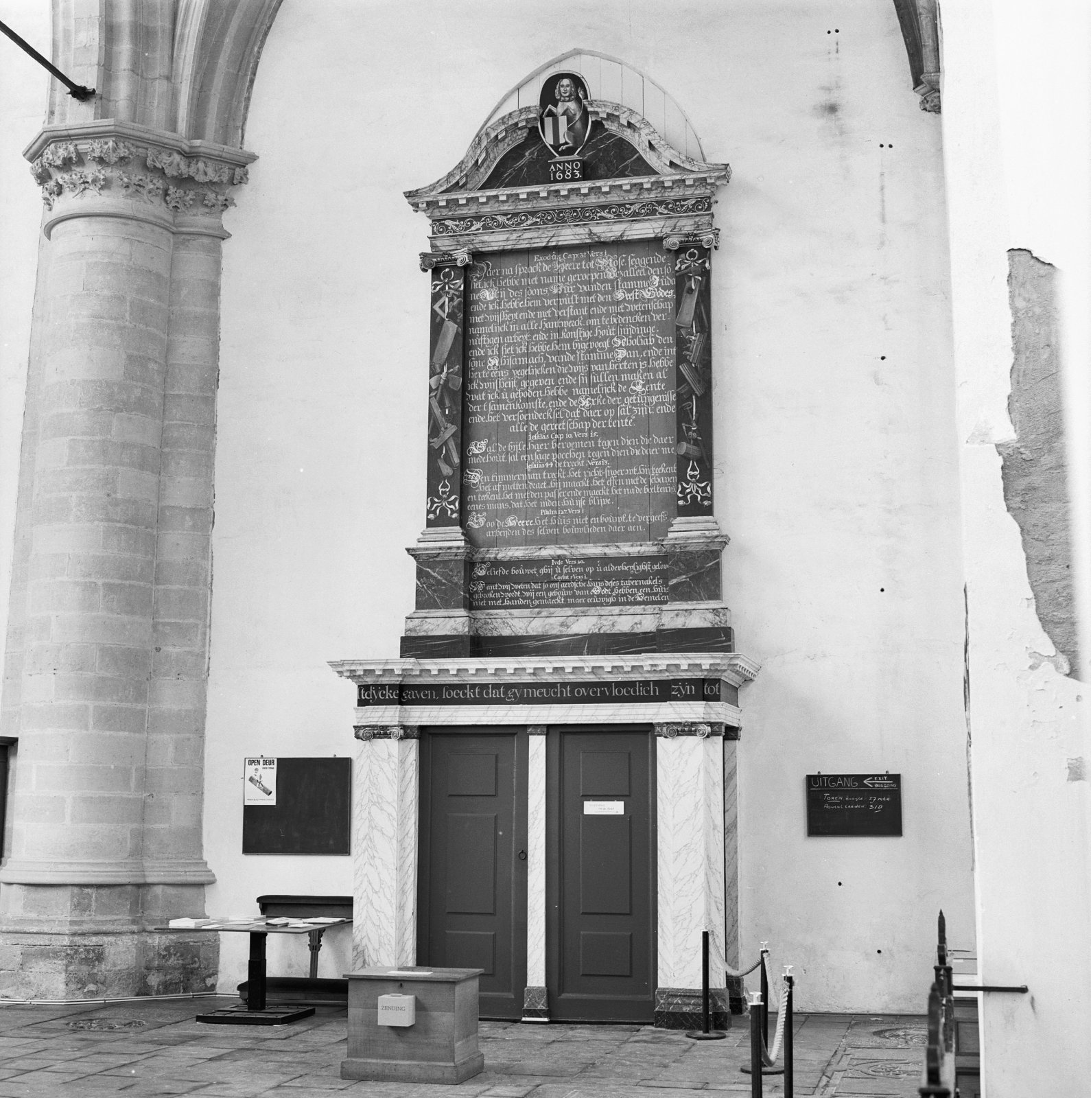 Interieur, tochtportaal en tekstbord van het timmerm...