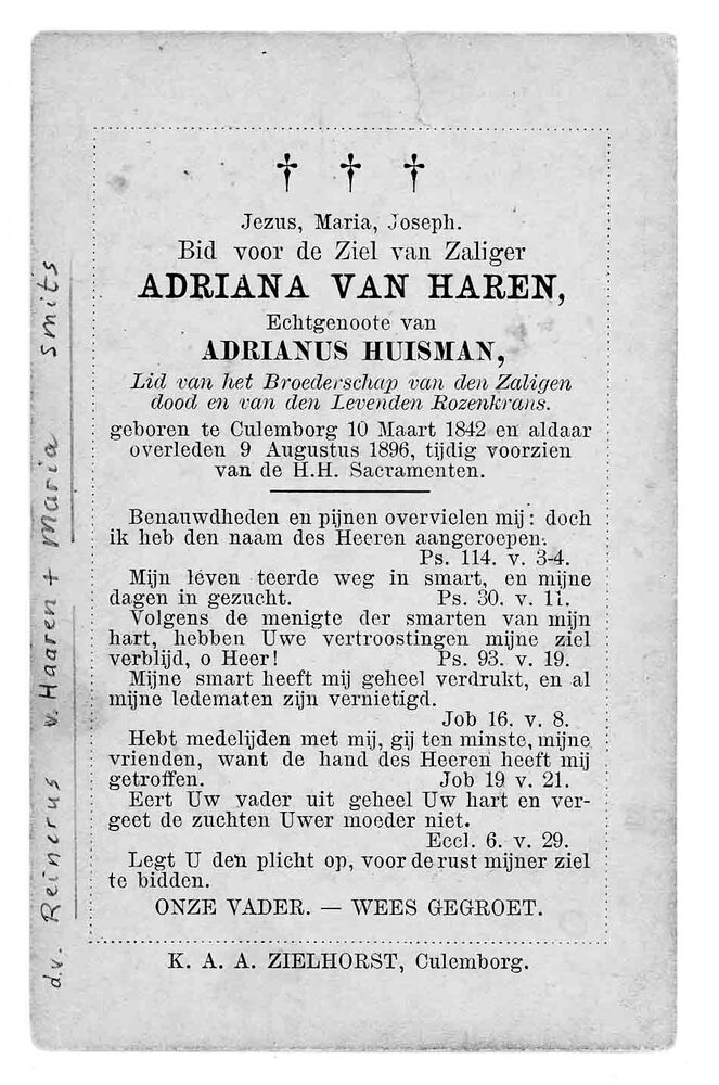 bidprent voor Adriana van Haren. Geboren 10-03-1842 ...