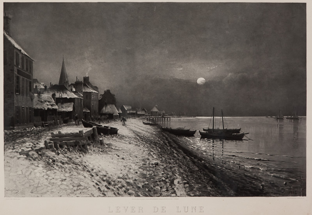 Litho, getiteld "Lever de lune" in zwarte houten lijst.