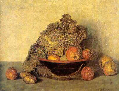 Stilleven met appels, een kool en een vaas