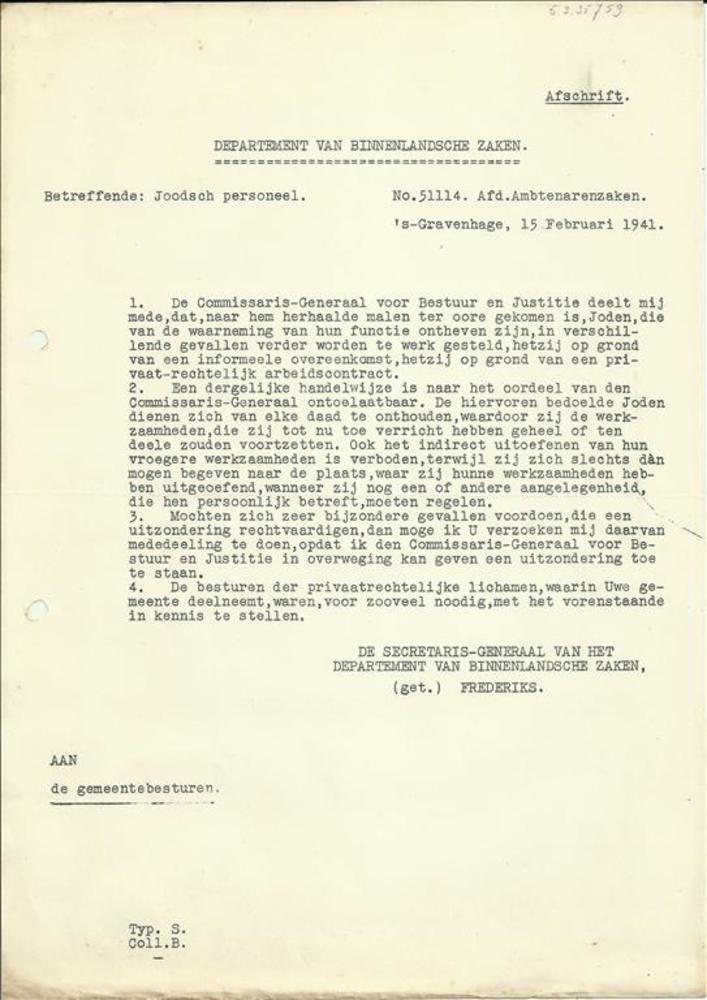 Brief van het Departement van Binnenlandsche Zaken b...