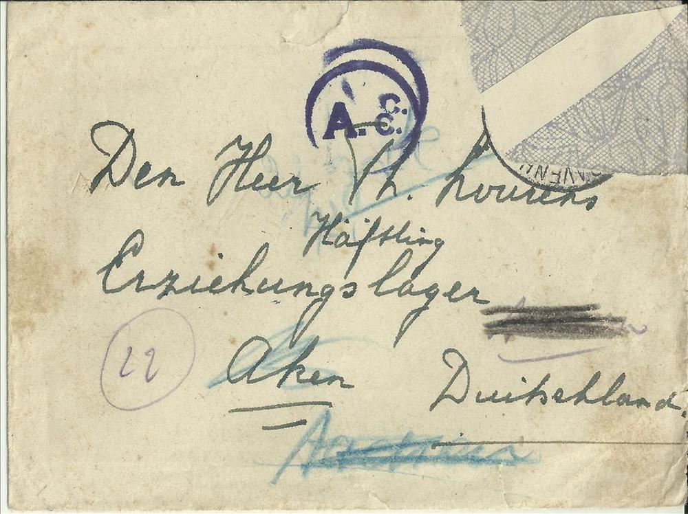 Enveloppe "aan Dhr Th Lourens Erziehungslager Aken D...