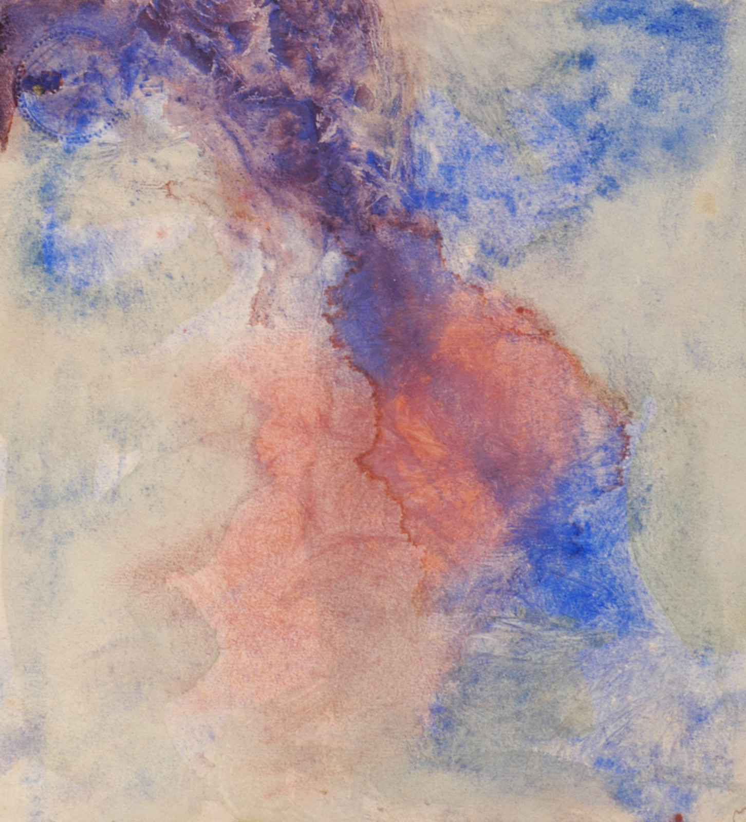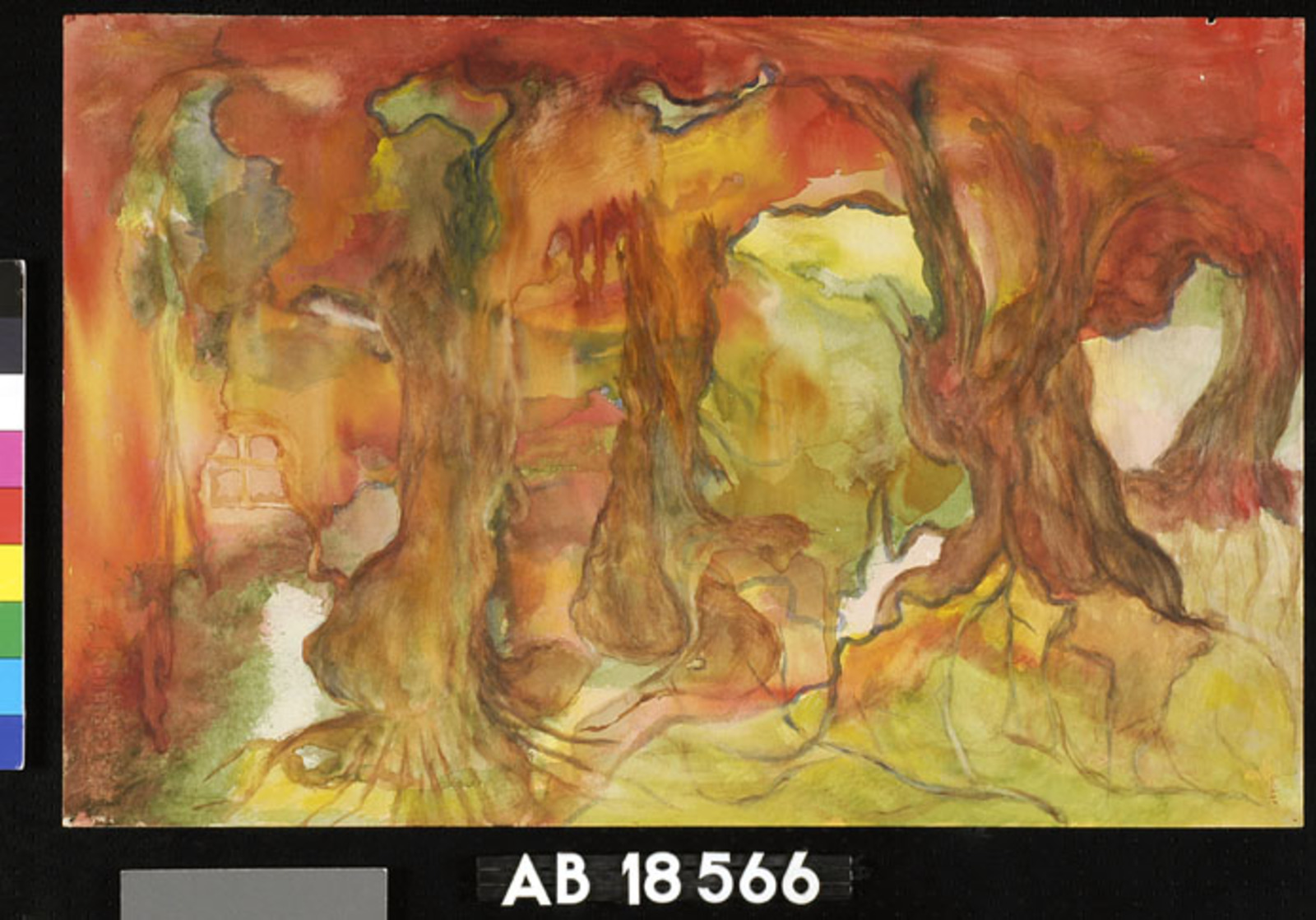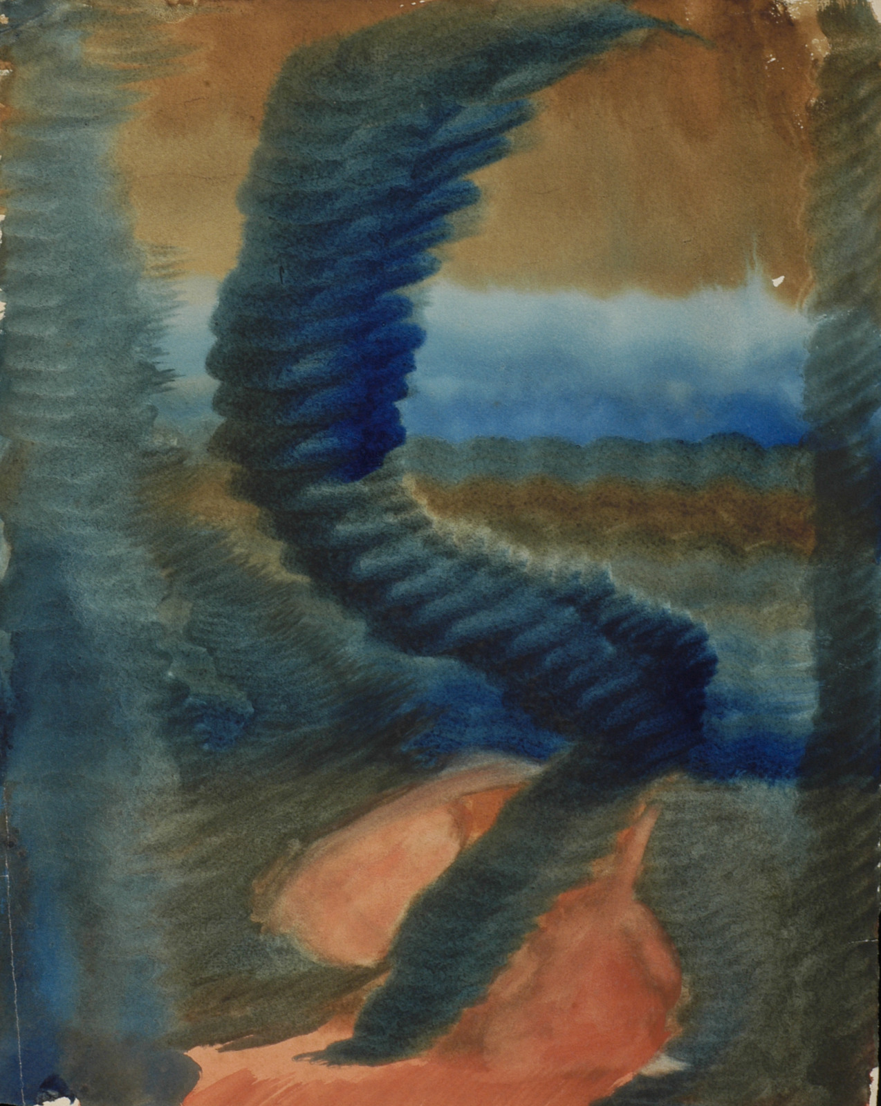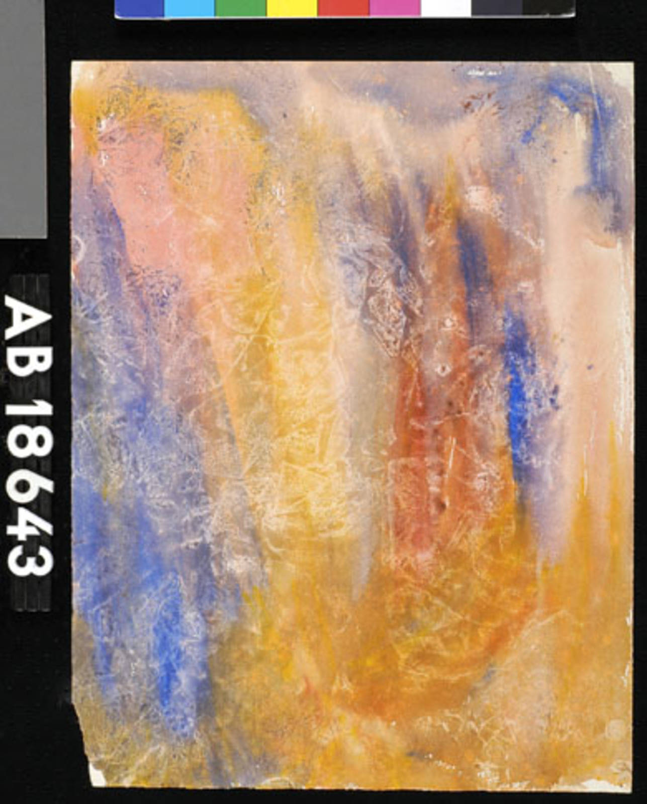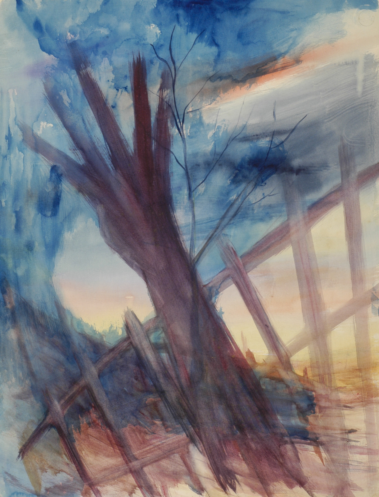 Kleurschets met donkere vorm (kale boom/hand?)