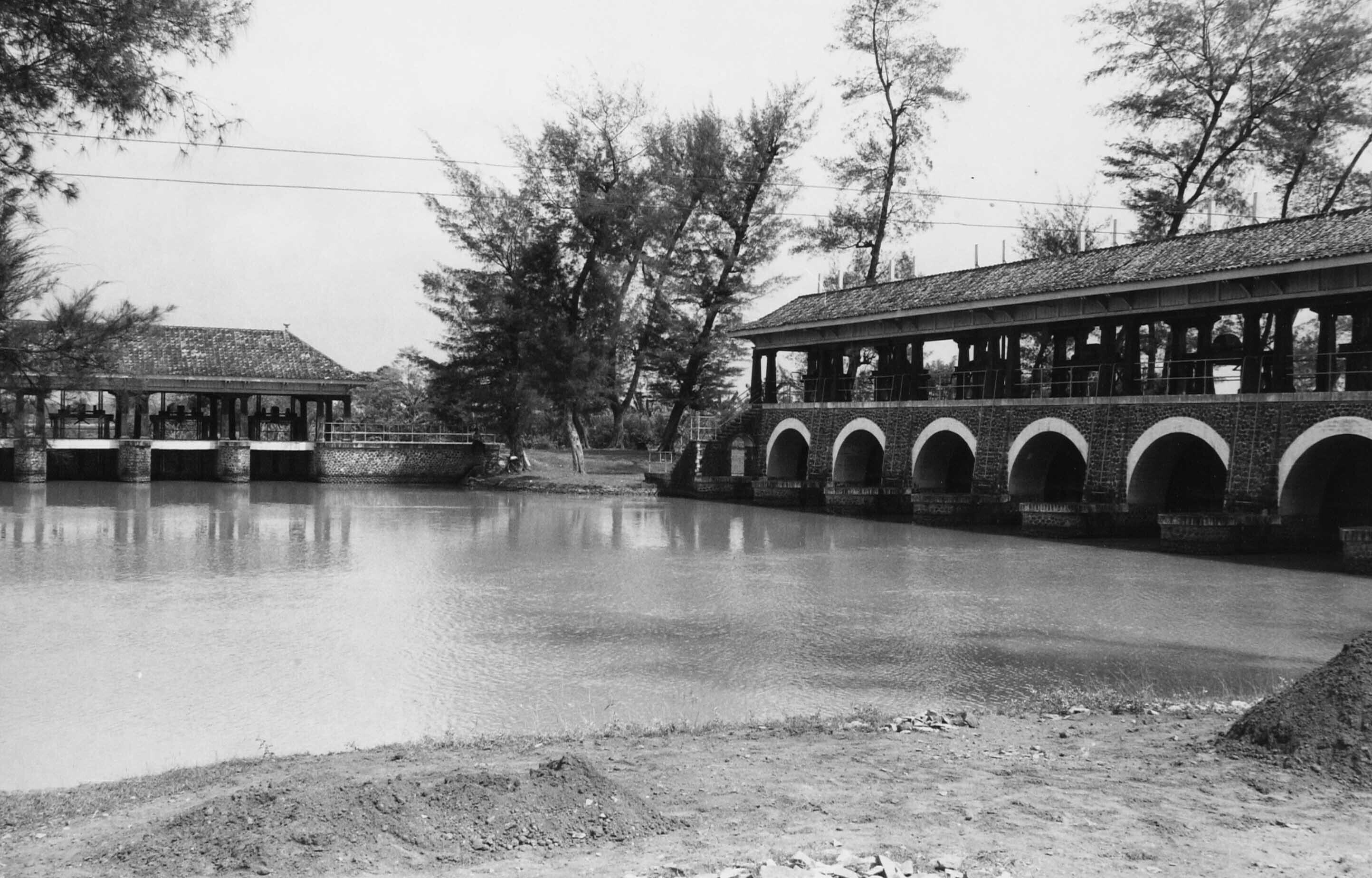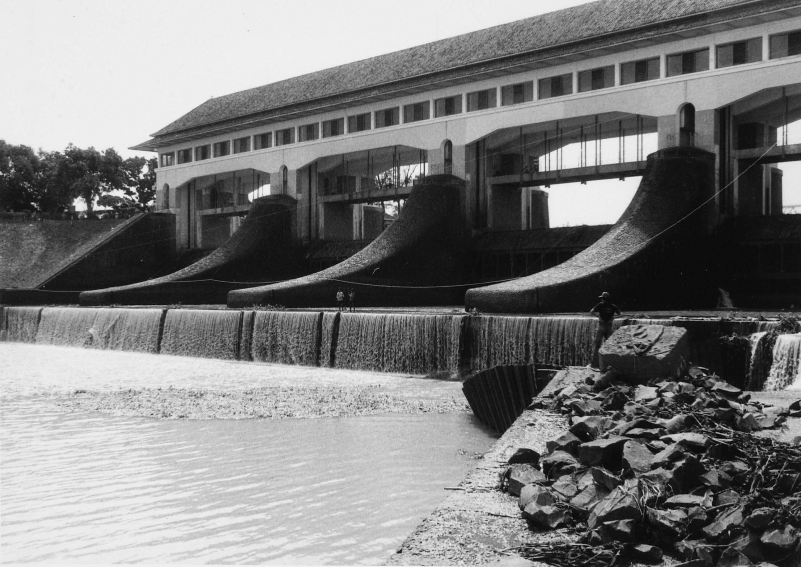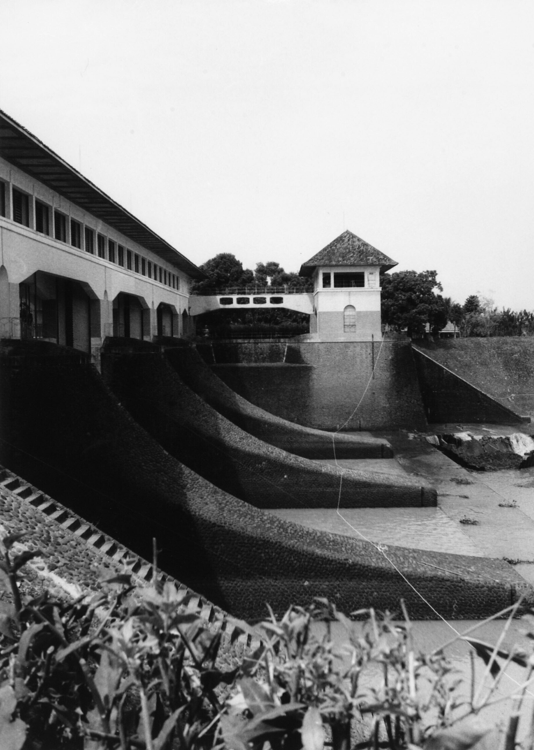 Jatiluhurstuwdam, gezicht vanaf de dam stroomafwaart...