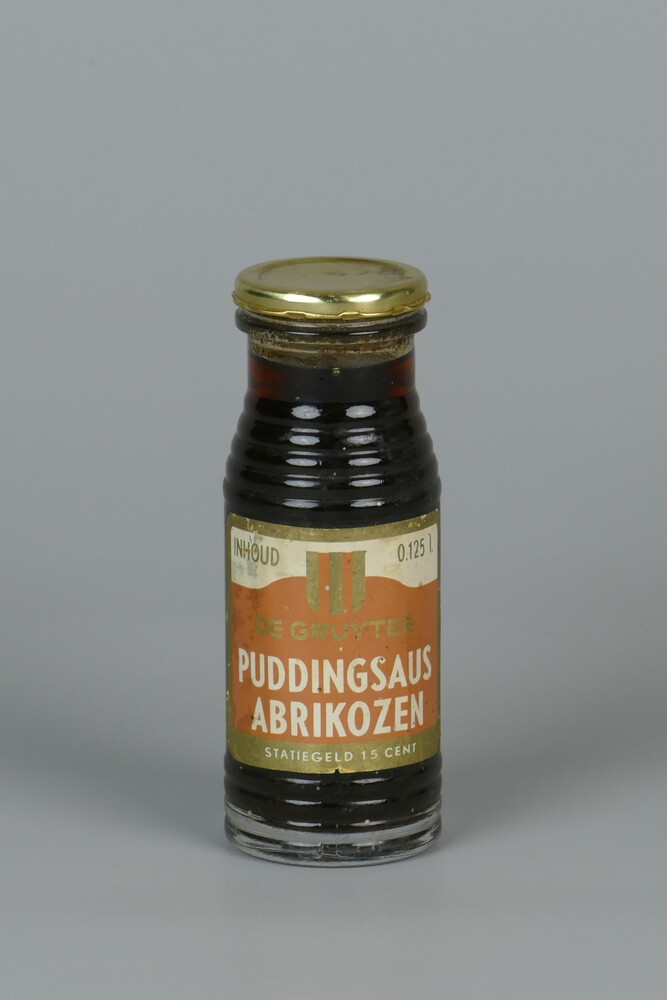 puddingsaus in fles van blank glas met goudkleurig d...