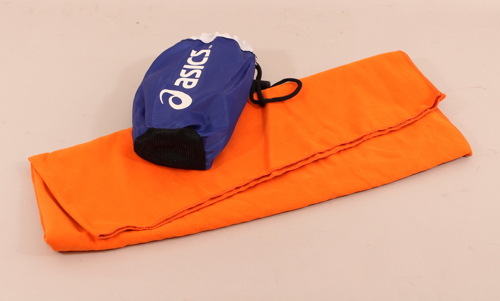 Opvouwbare oranje handdoek in blauw hoesje met opdru...