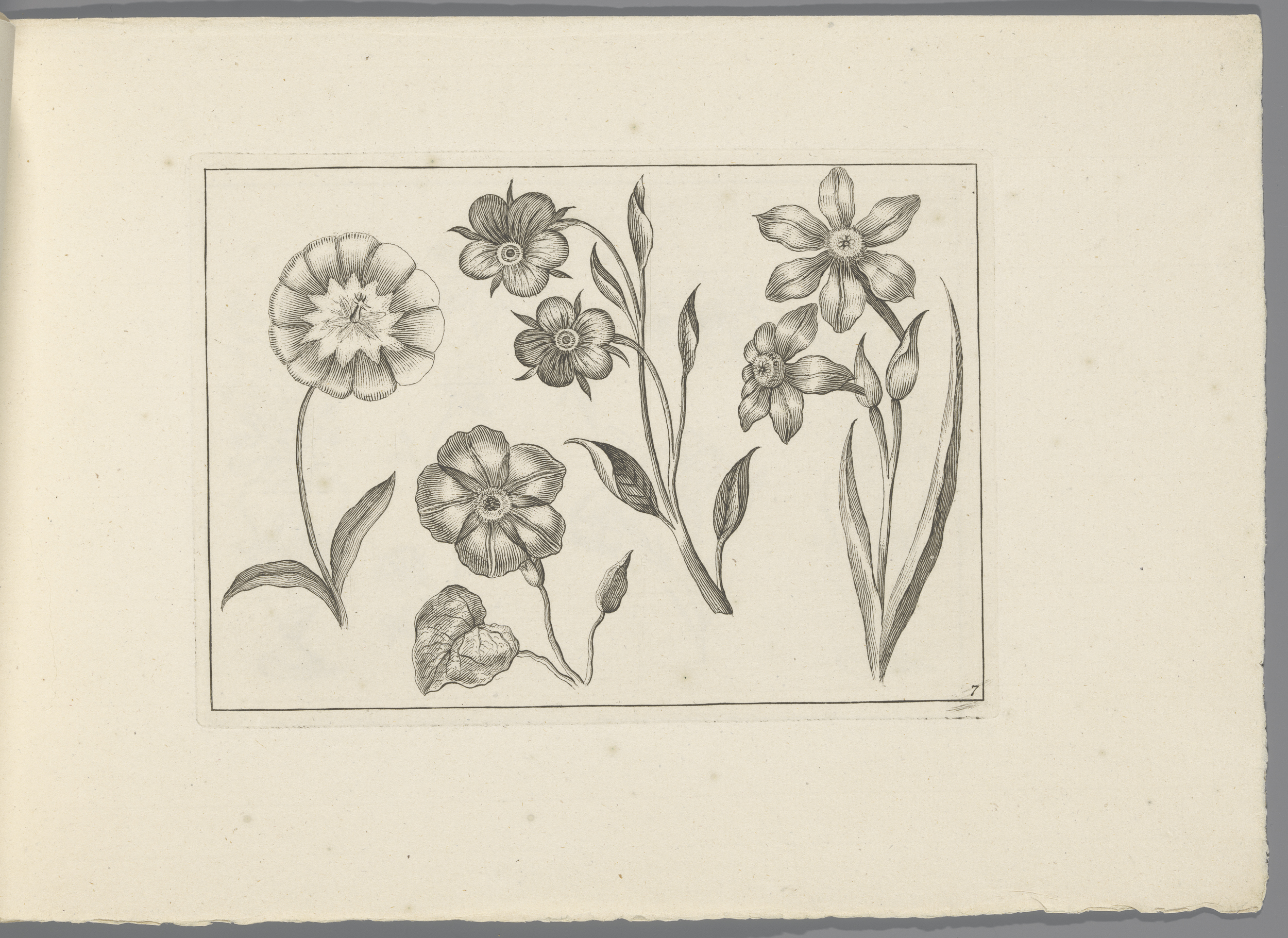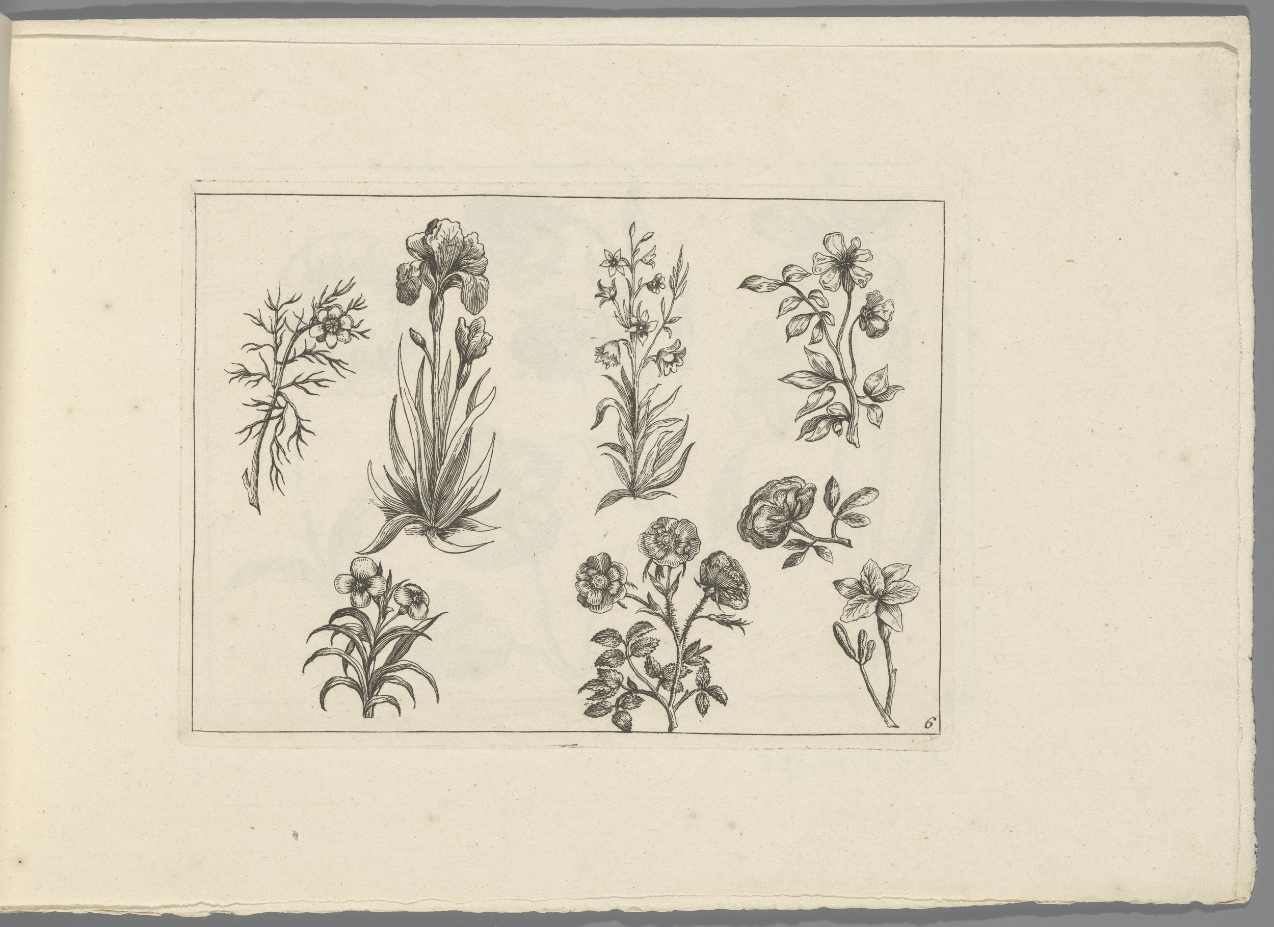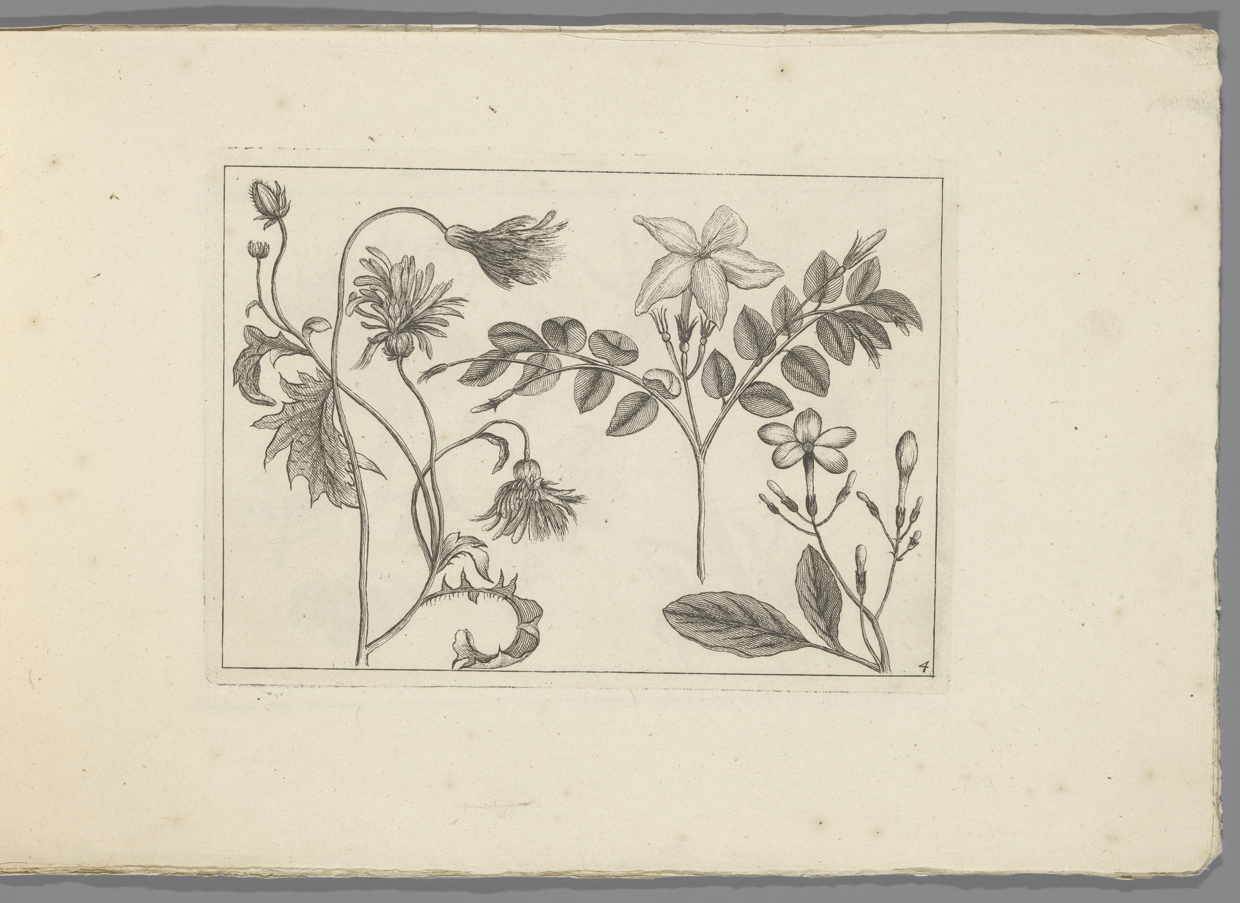 Diverse bloemen, geflankeerd door twee geornamenteer...