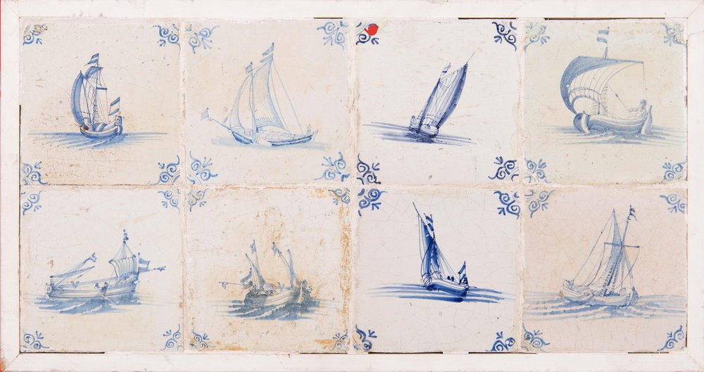 Tegelveld van 8 aardewerken tegels met tinglazuur, b...