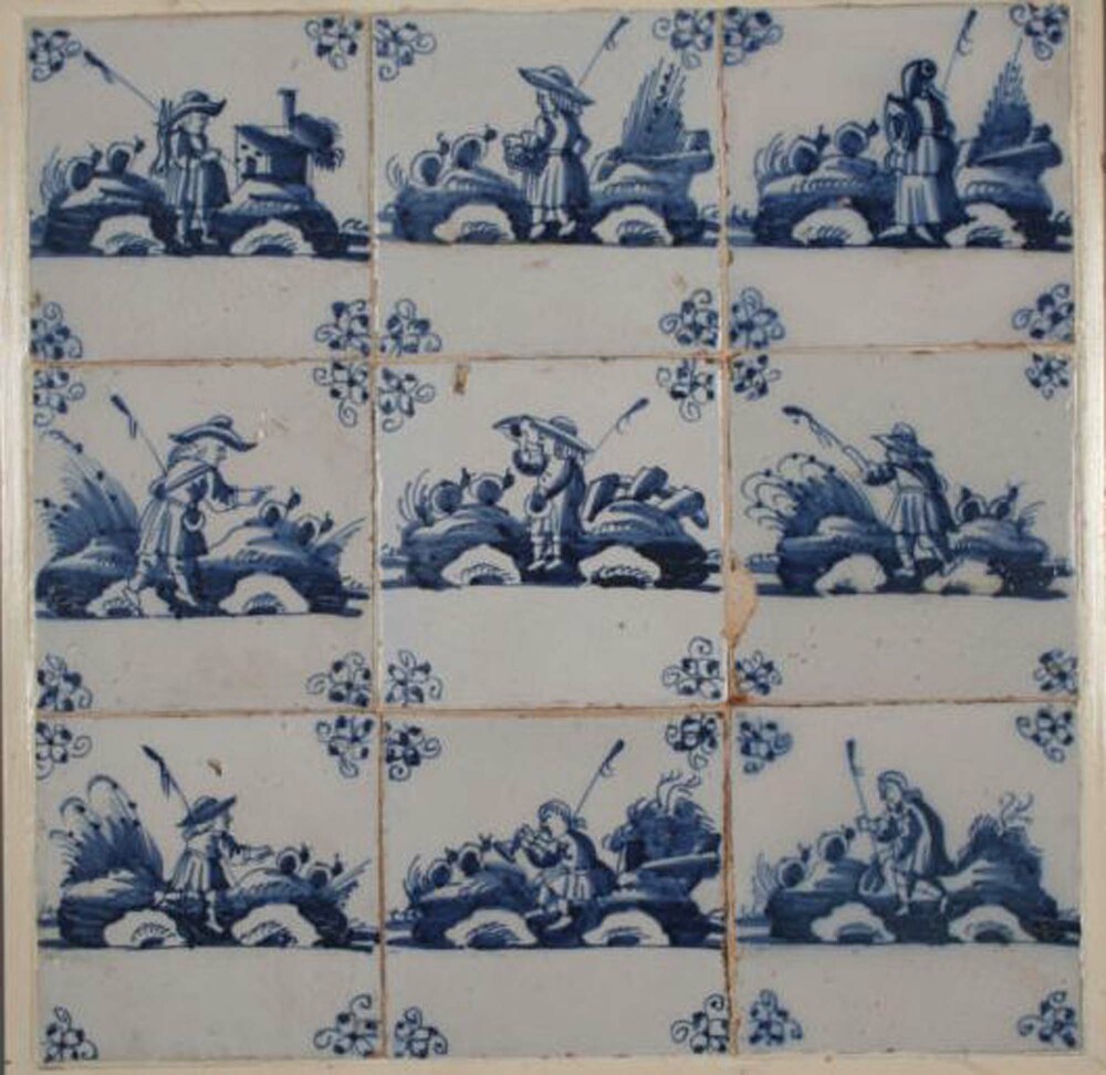 Tegels van aardewerk met tinglazuur, voorstellende v...