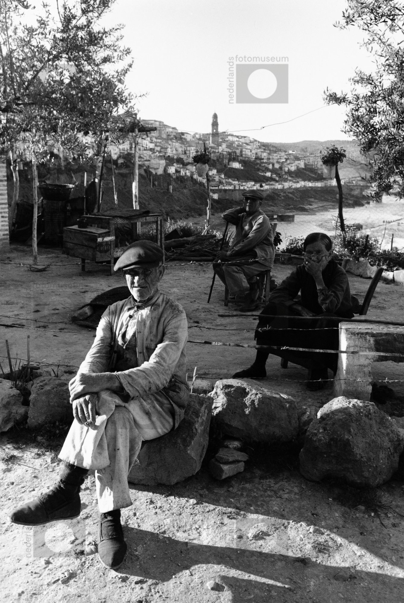 Oude mensen zitten buiten , stad op de achtergrond, ...
