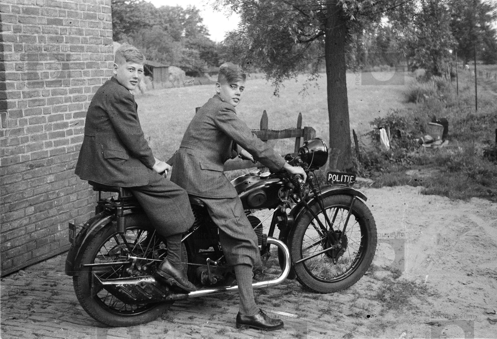 Twee jongemannen op politiemotor bij huis (1943-1945)
