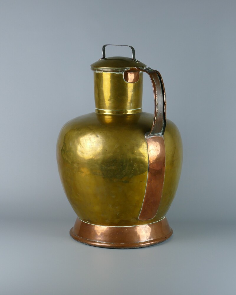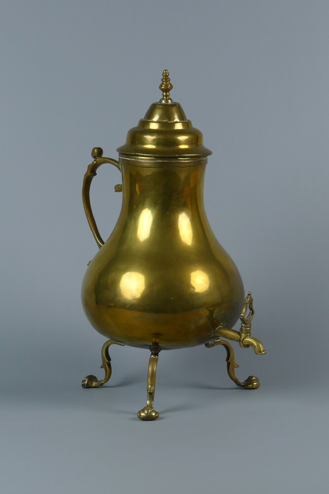 Koffiekan van geel koper op drie poten met kraan.