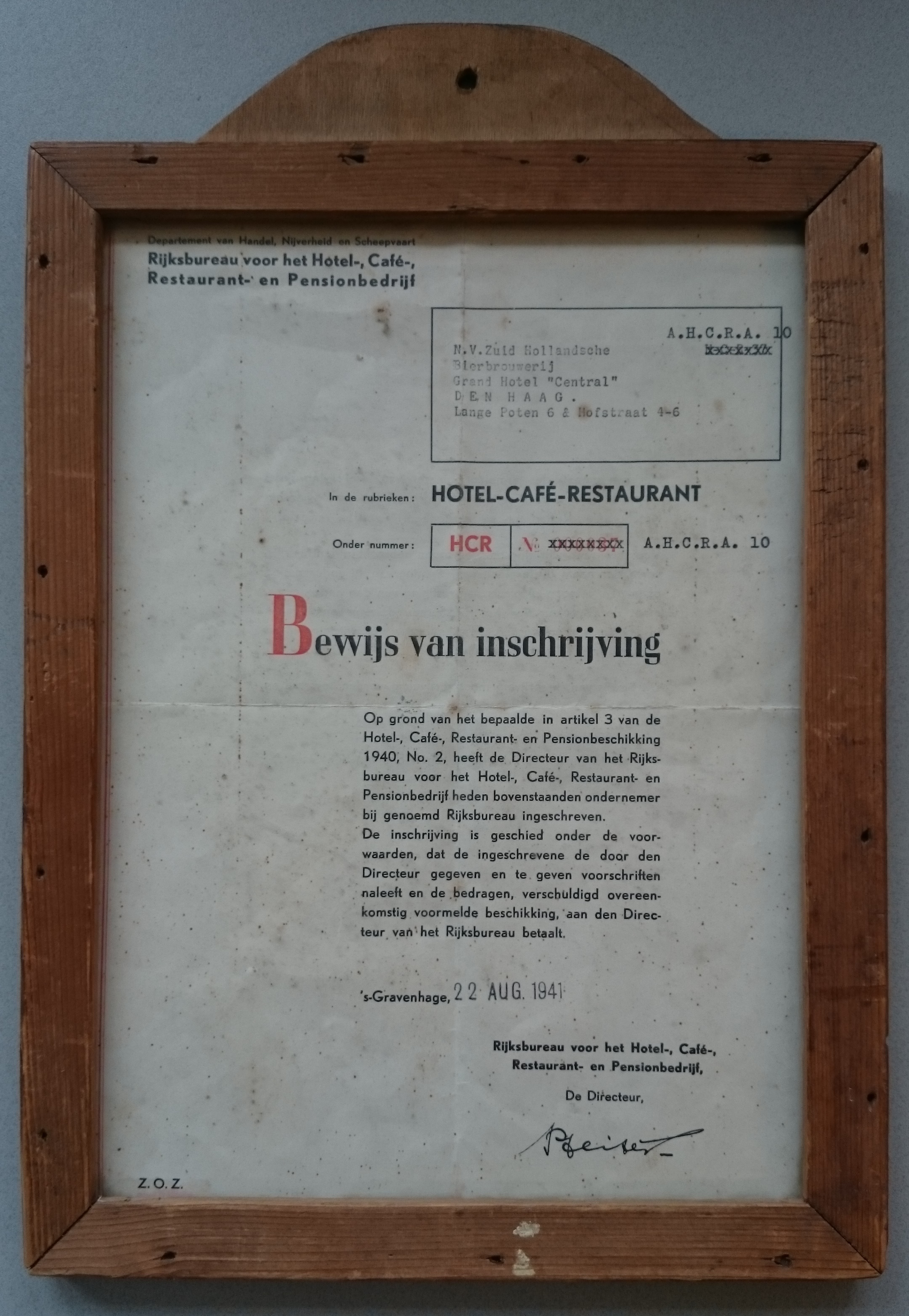 Bewijs van inschrijving van het Grand Hotel "Central...