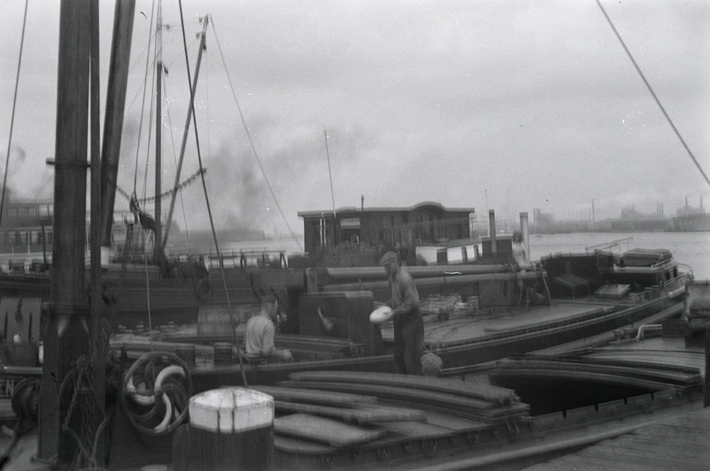 Twee personen maken hun schip gereed voor vertrek.