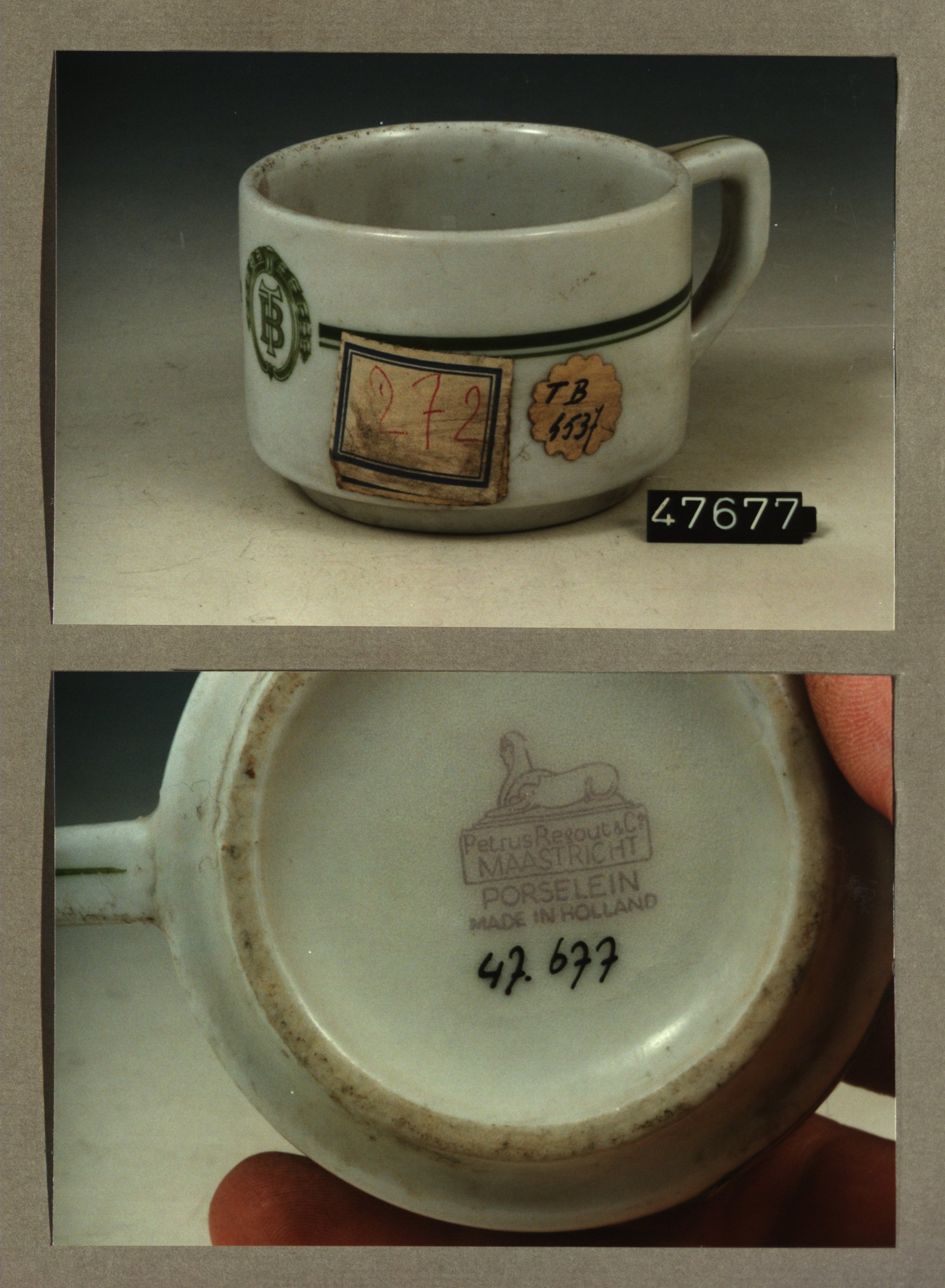 Kop met opschrift, model J met decor Twente bank TB