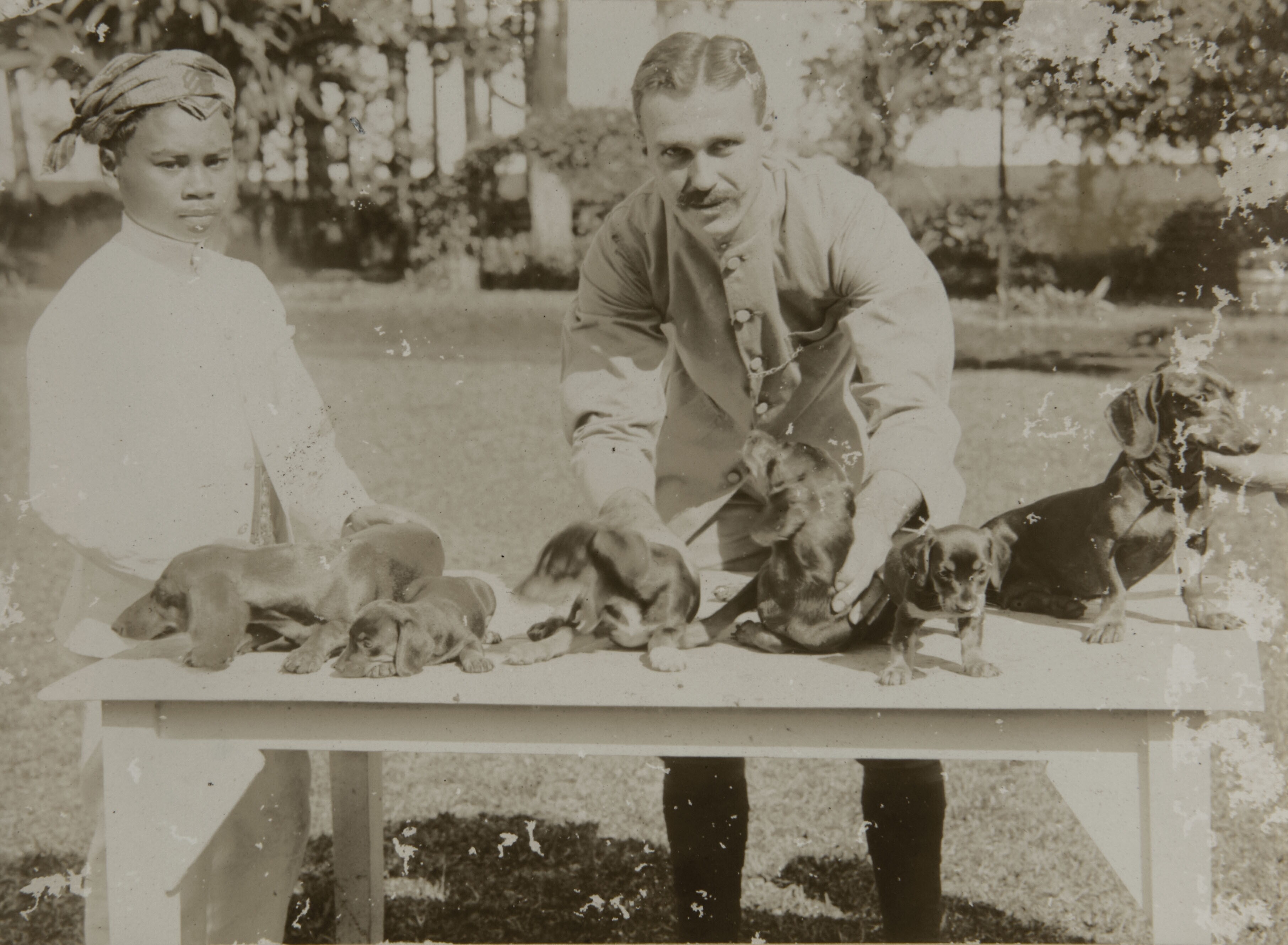 Mannen bij een tafel met volwassen teckels en pups, ...