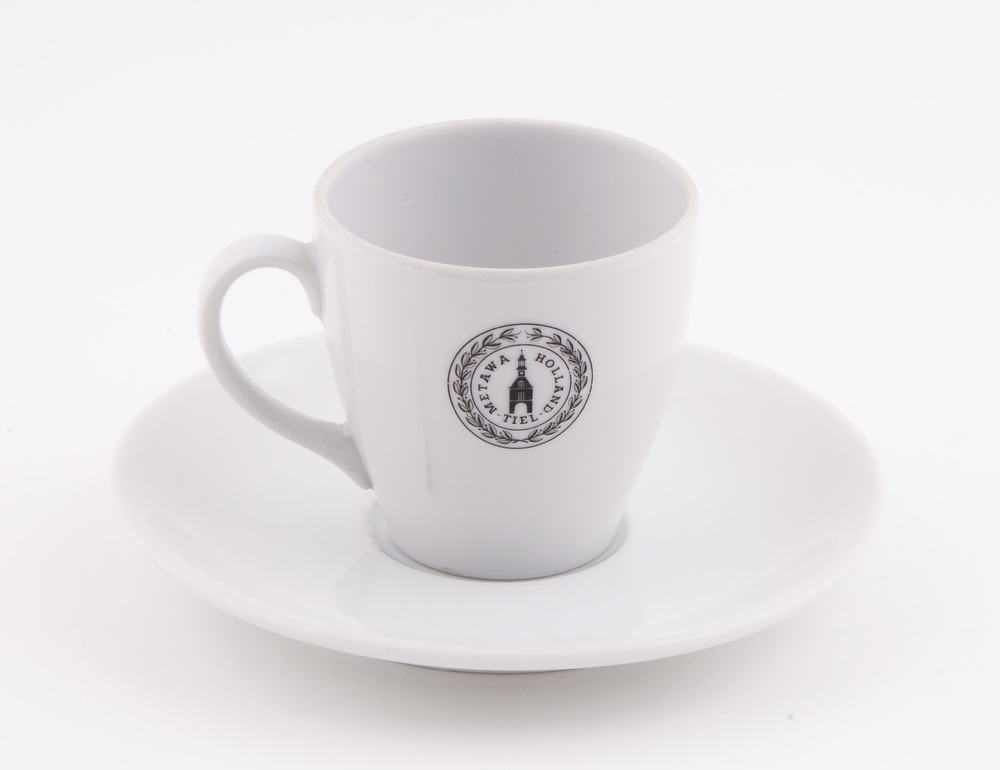 Kop en schotel van wit aardewerk, vervaardigd door M...