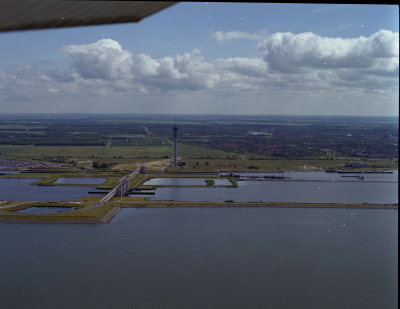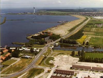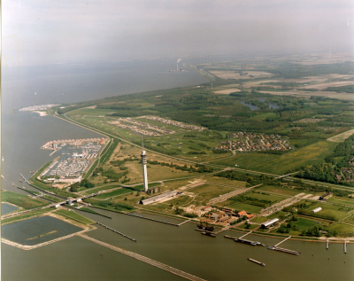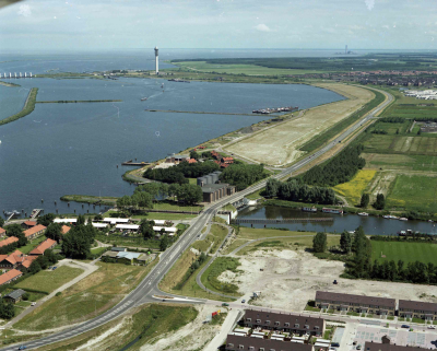 Luchtfoto van de Stevinsluizen bij Den Oever, 1982
