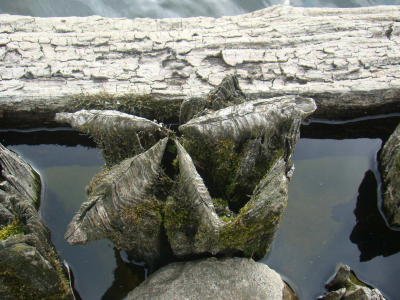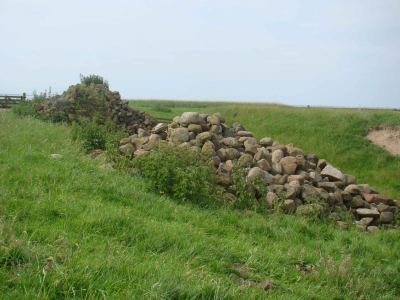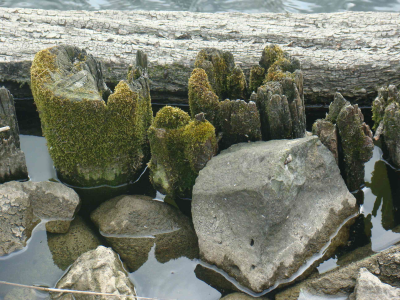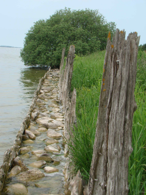 Resten van een oud houten palenscherm bij de Oudemir...
