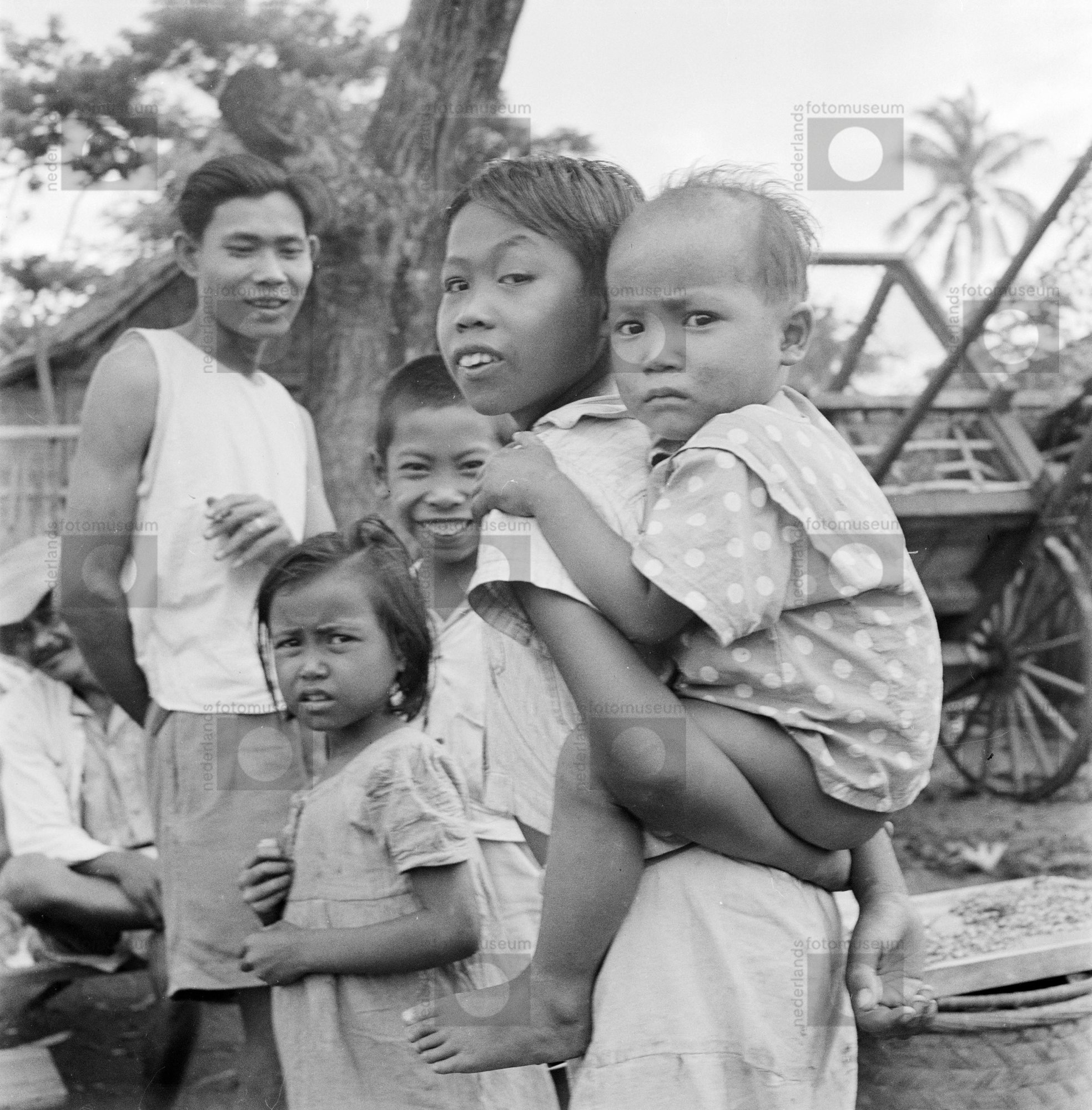 Portret van vier kinderen en een man, waarbij één ki...