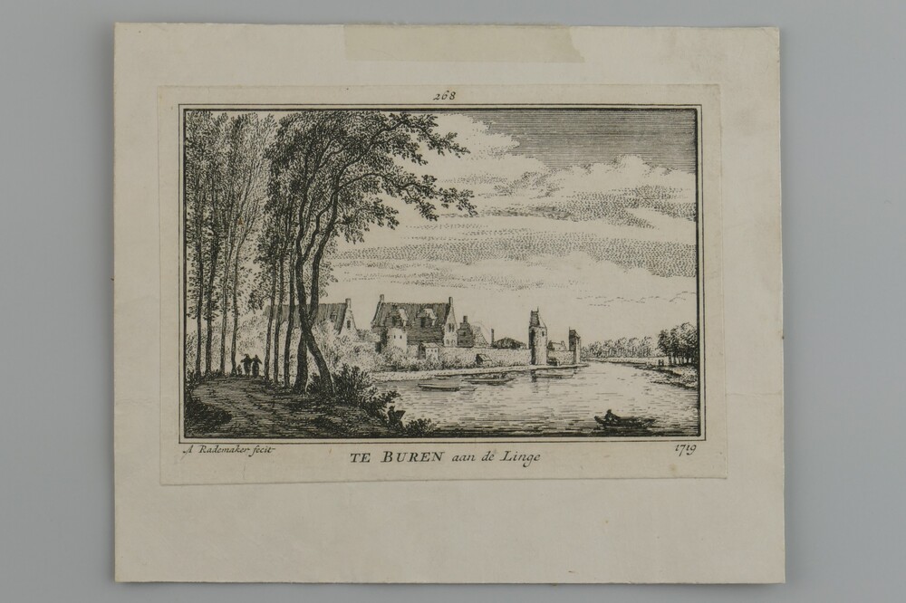 Gravure voorstellende TE BUREN aan de Linge, vervaar...