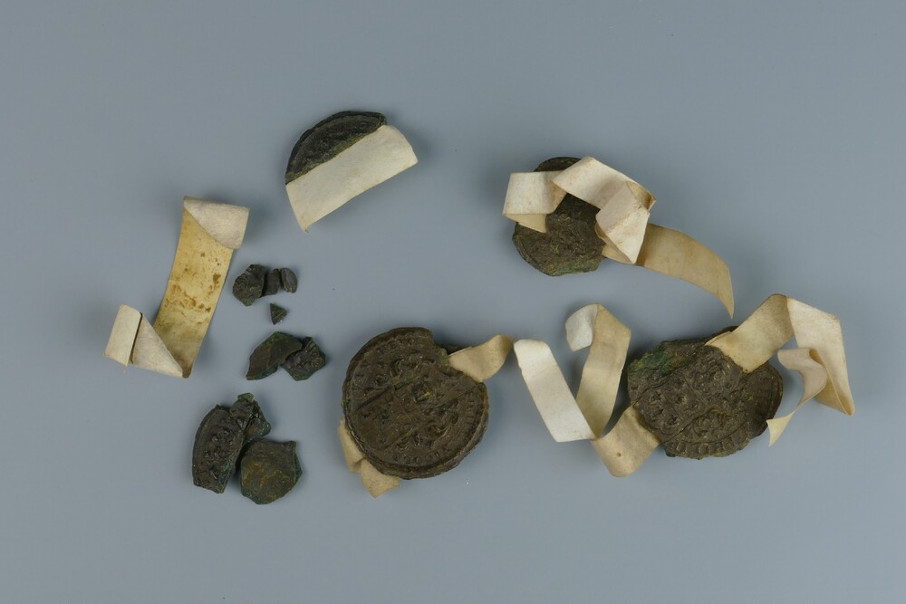 Zegels van bruine lak met lint in kartonnen doosje.