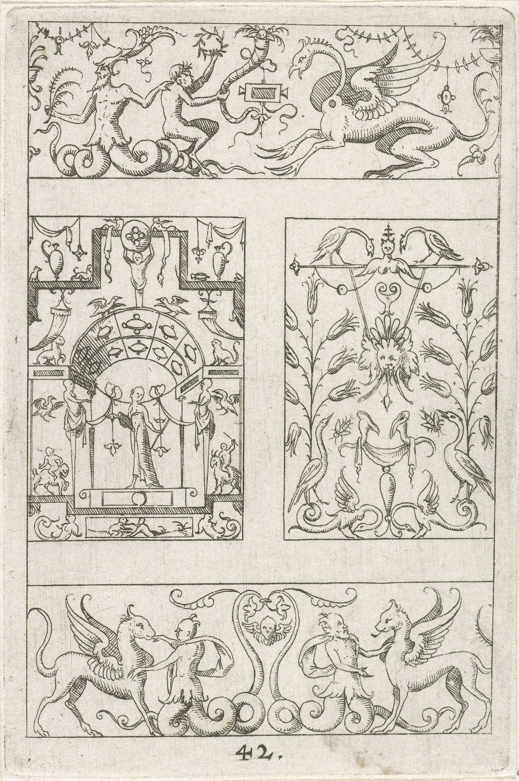 Bovenaan en onderaan een fries, daartussen twee klei...