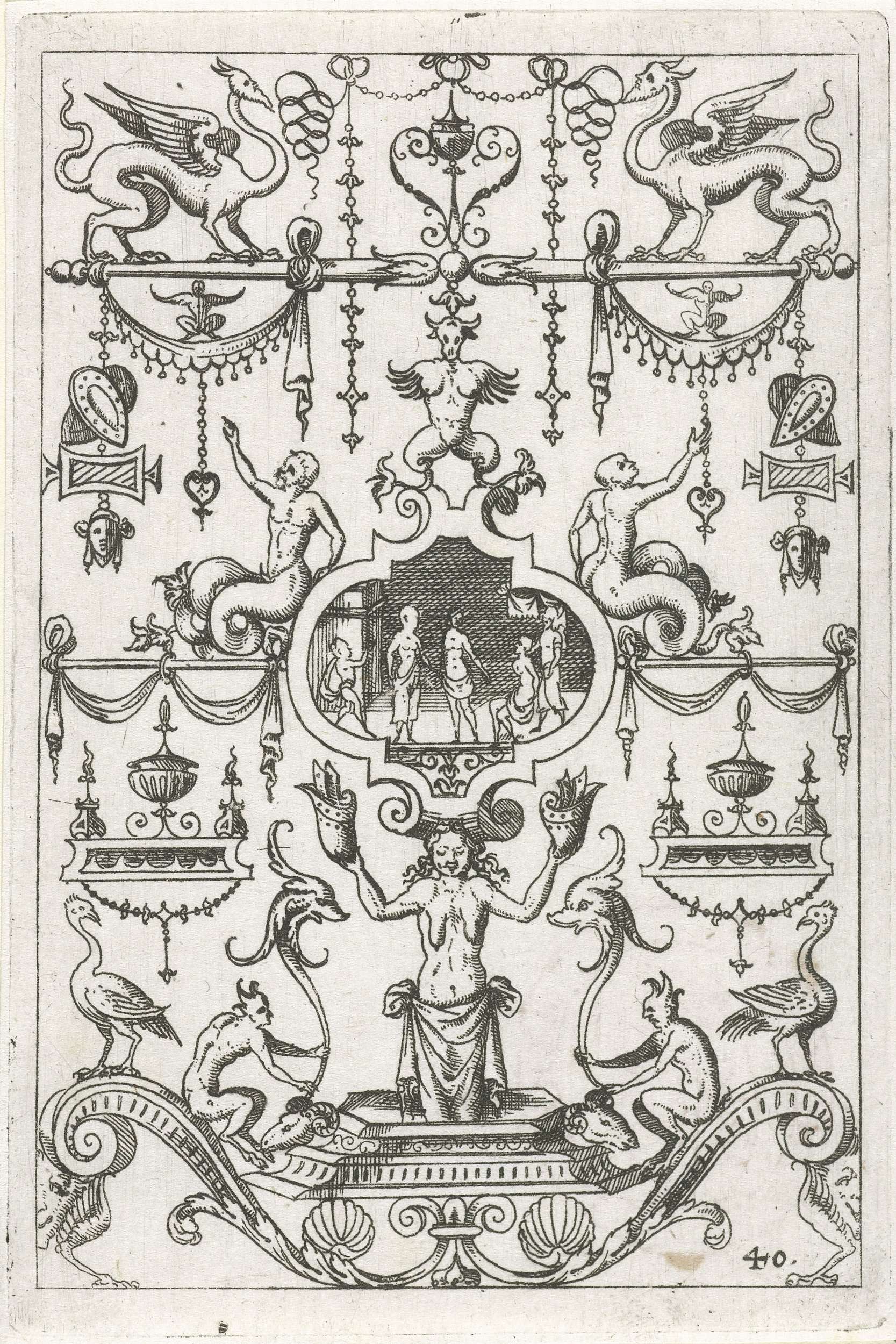 Kandelaber, midden onder knielt een vrouw op een pos...