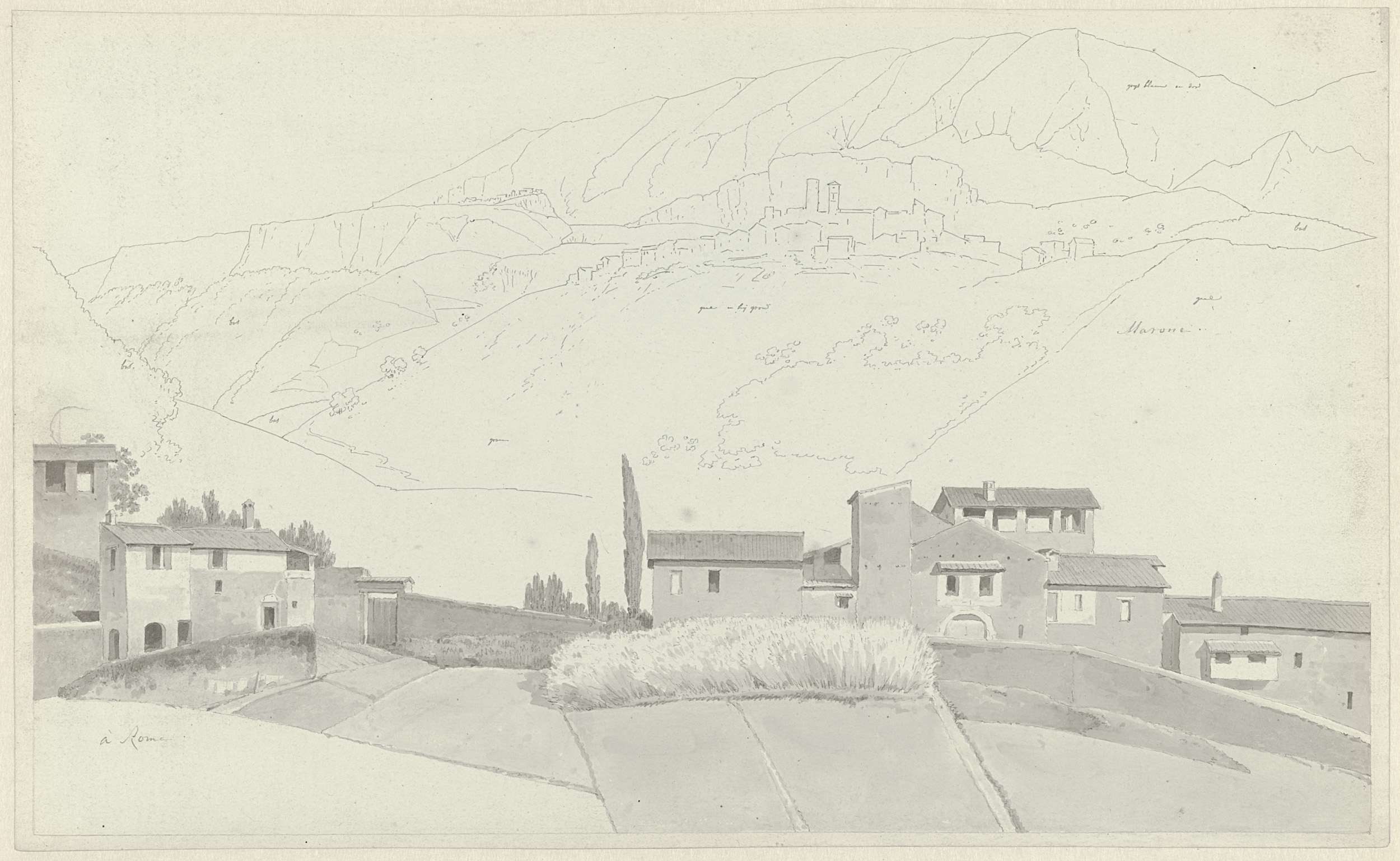 Gezicht op Roviano, op de voorgrond huizen in Rome