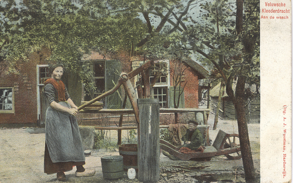 Veluwsche Kleederdracht. Aan de wasch