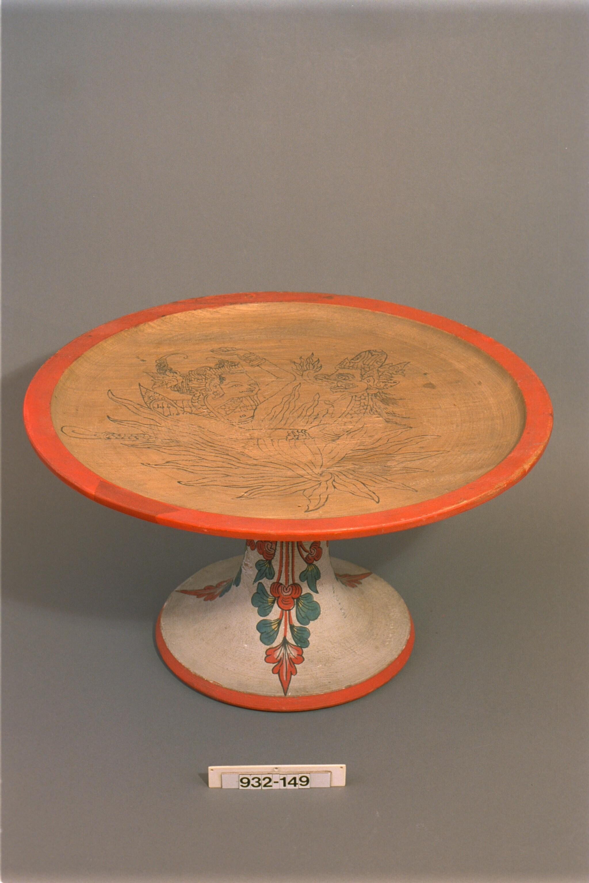 Houten schaal op voetstuk versierd met een tekening ...